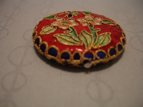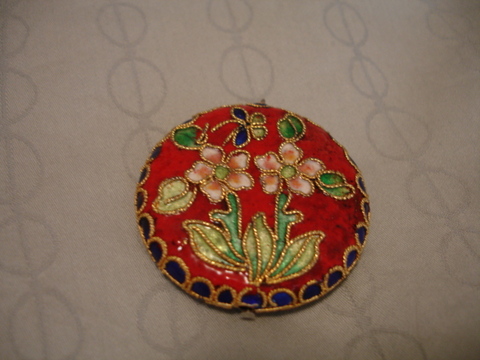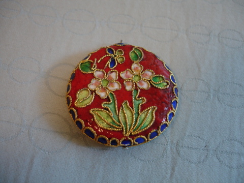 Big, loud pin from the 1980's. The color is kind of greenish turquoise. Makes a statement! There is a little scratch in the center where the paint is knicked but could easily be fixed with a blue/green nail polish.