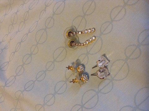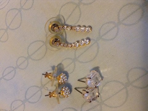 Pretty, sparkly little earring collection. Not sure if they are crystal or glass. I can trade all 3 at once or each if you like. One pair (the larger crystal studs) does not have backings and this same pair has some scratches and tarnish on the metal prongs. No missing crystals.