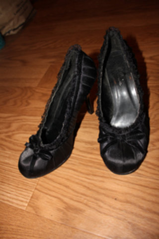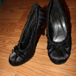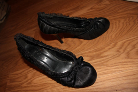 Black heels with lace and a bow on the top.