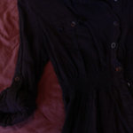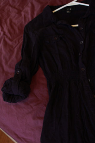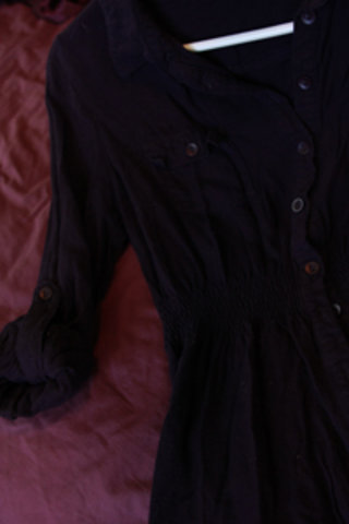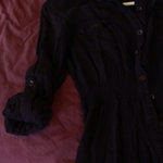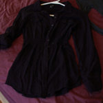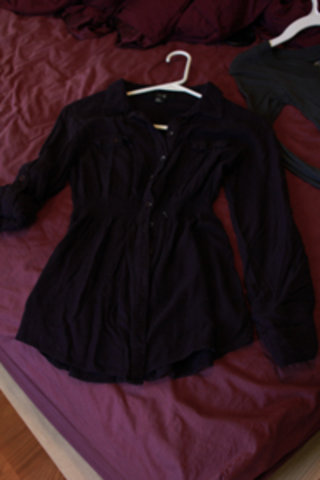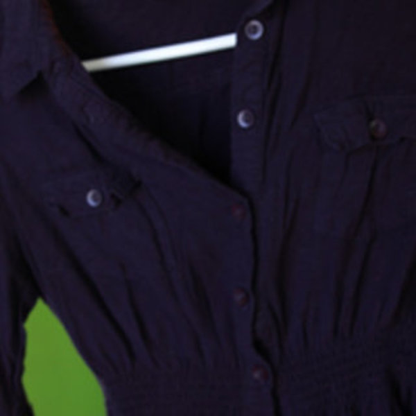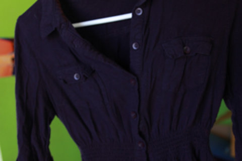 Nice shirt, button up, with cute button pockets and buttons to roll up the sleeve if you want. It has a little elastic at the waist to give shape to the shirt. Its dark purple. I hope the pictures aren't to dark. I like it I just don't wear it to much.