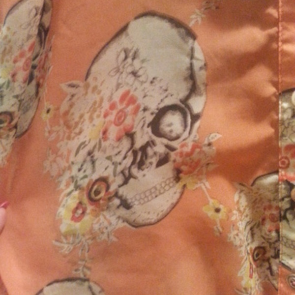 I bought this used from platos closet and have only worn it once. It is missing the top button but it looks better unbuttoned anyway. I have grown since I bought it so its now to short for me :(. It is shorter in front and longer in the back.