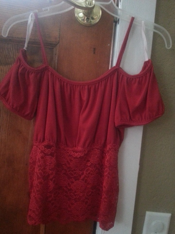 Body Central off the shoulder top, with thin spaghetti like straps. lace bottom. in my opinion, i would say it could fit a small also