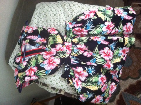 Hawaiian printed styled dress side cutouts very cute and form fitting top. It's pretty short but not revealing plus tule underneath keeps the bottom shaped. So cute! It's my favorite dress I have I just can't fit anymore.