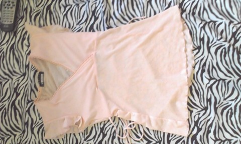 Worn once only, this is beautiful but too big for me. Silky with Lace detailing and tiny purple bows on straps. Pushup.