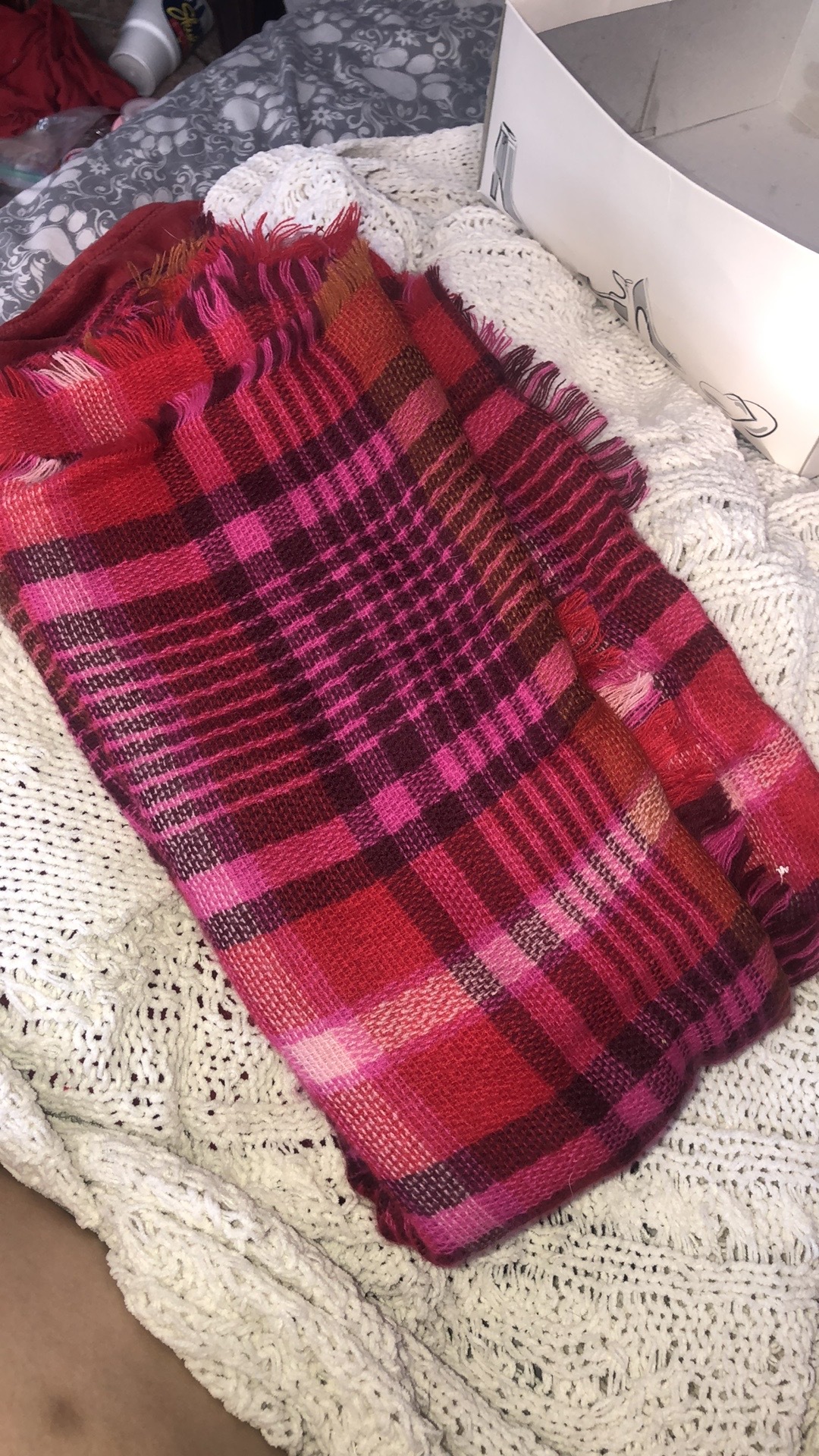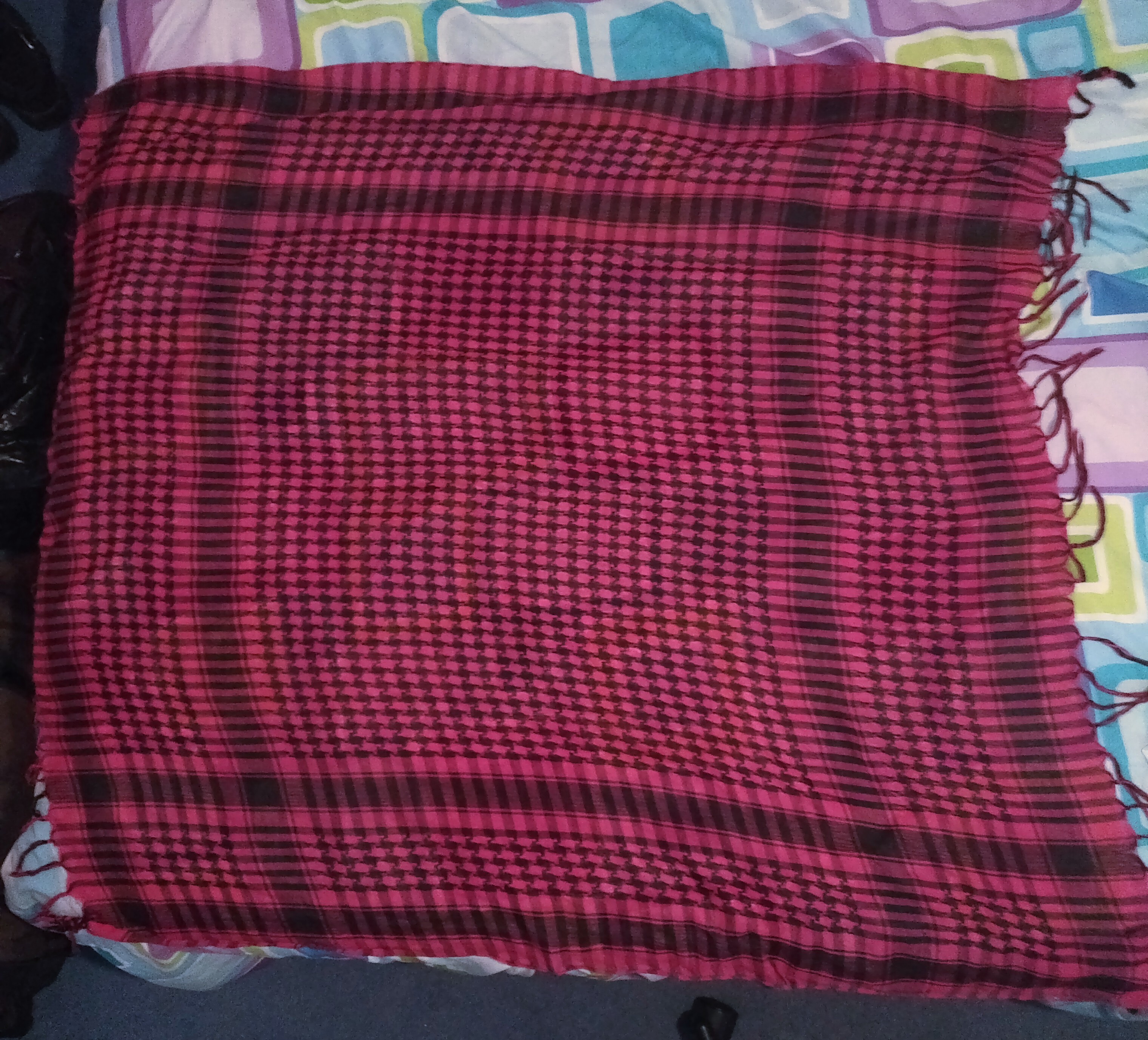 3' 6" by 3' 6" square scarf with tassels on two edges. Slightly wrinkly, but otherwise in great condition. Brand unknown.