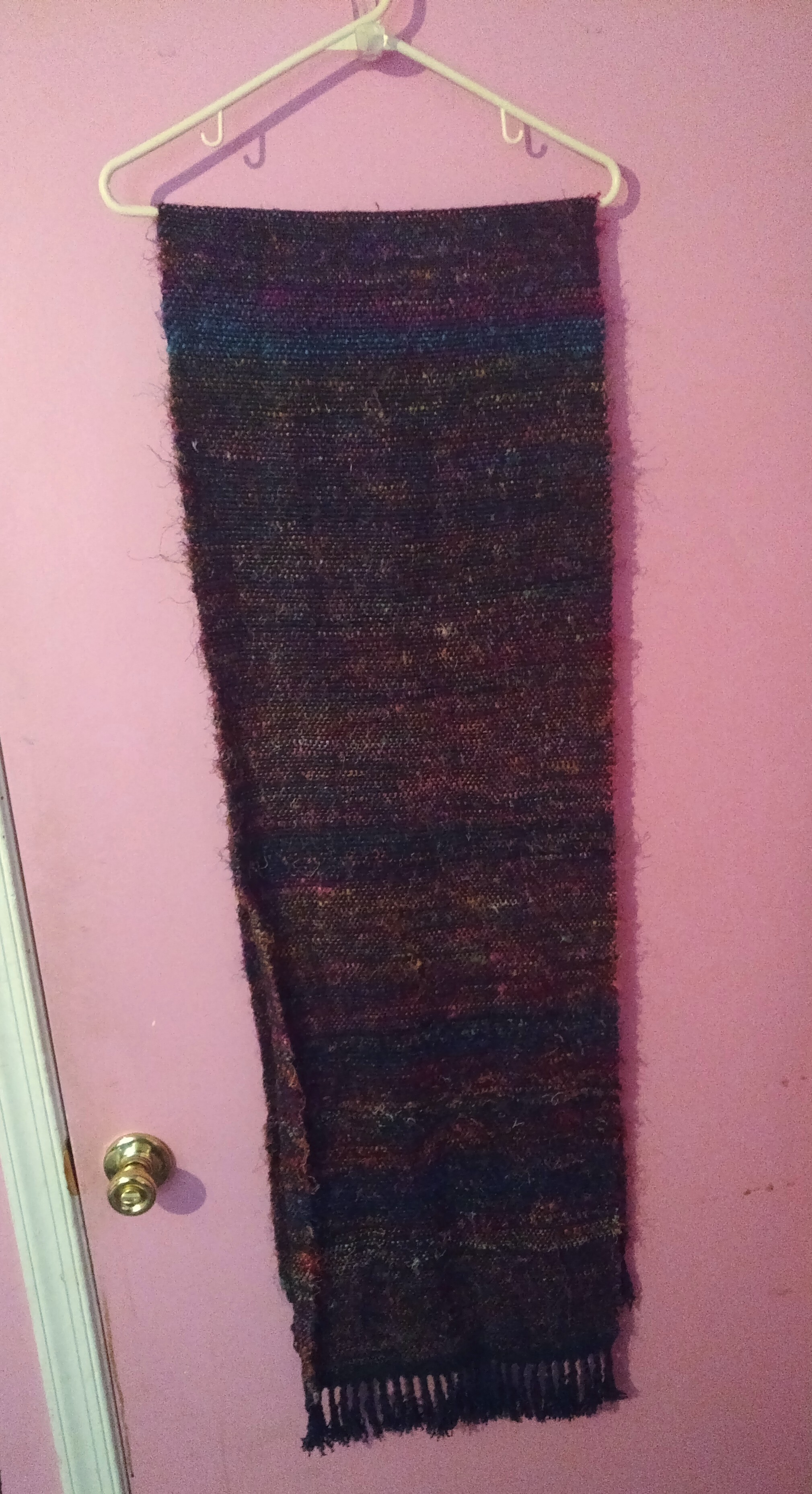 Scarf with tassels. Black base with multicolored threads weaved in. many threads are frayed and loose, but it's still wearable.