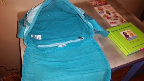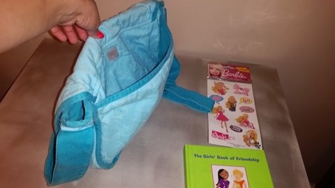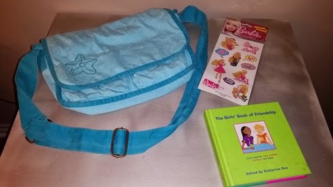 Like new Hatley bag, only used couple times-cannot tell. It measures 13" x 9" when closed, adjustable strap. Features one inside zipper pocket and outside has velcro pocket as well. Comes w/ brand new Barbie stickers and a cute friendship book.