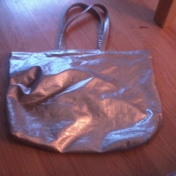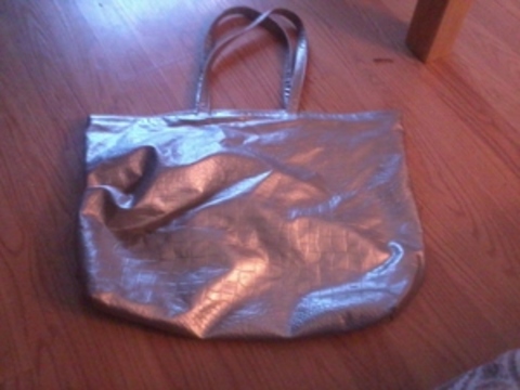 This is an extra large shoulder bag. It is gold and has a fake croc pattern to it. The inside is cloth with a zippered compartment. Some signs of wear but in excellent condition.
