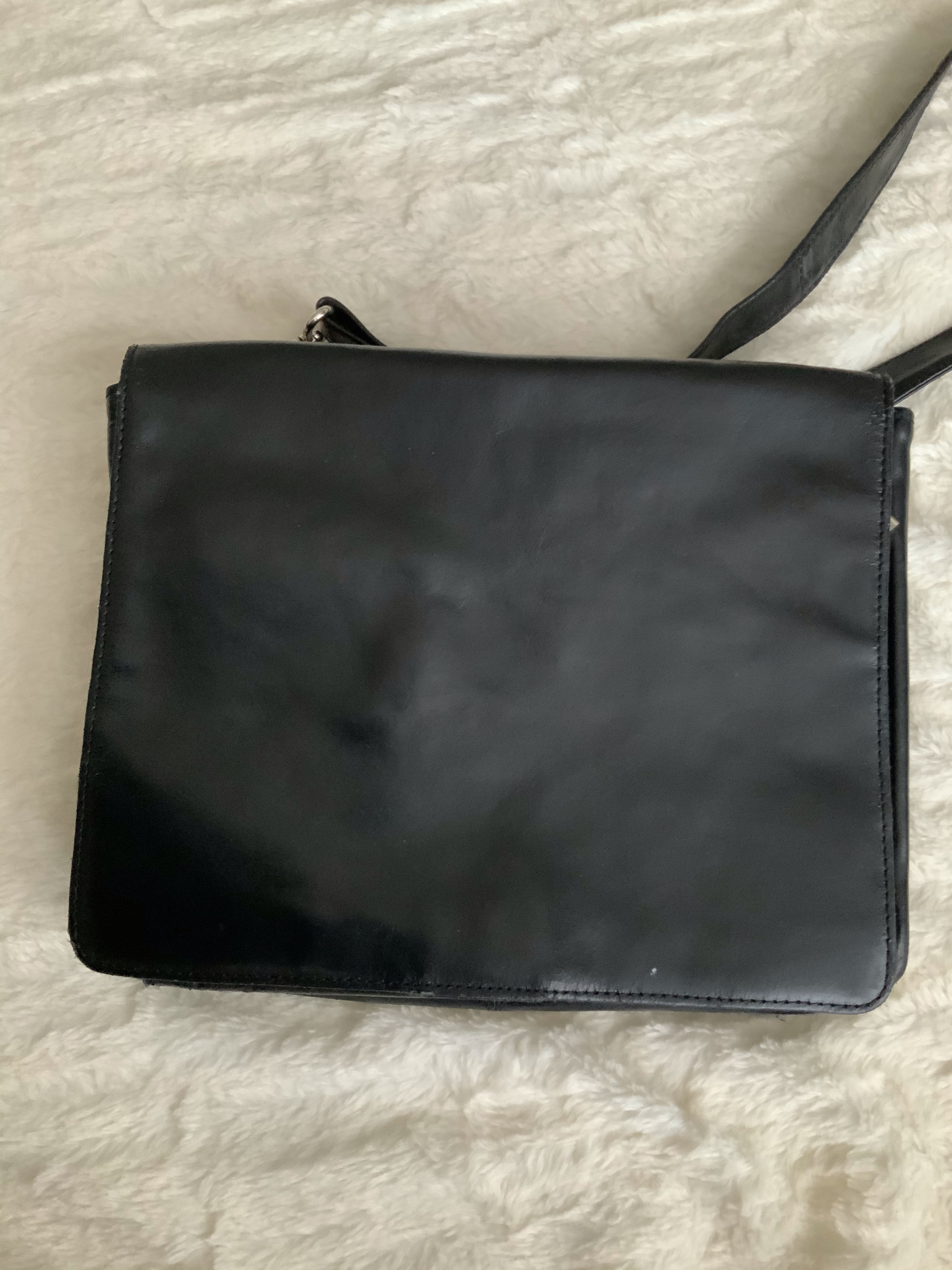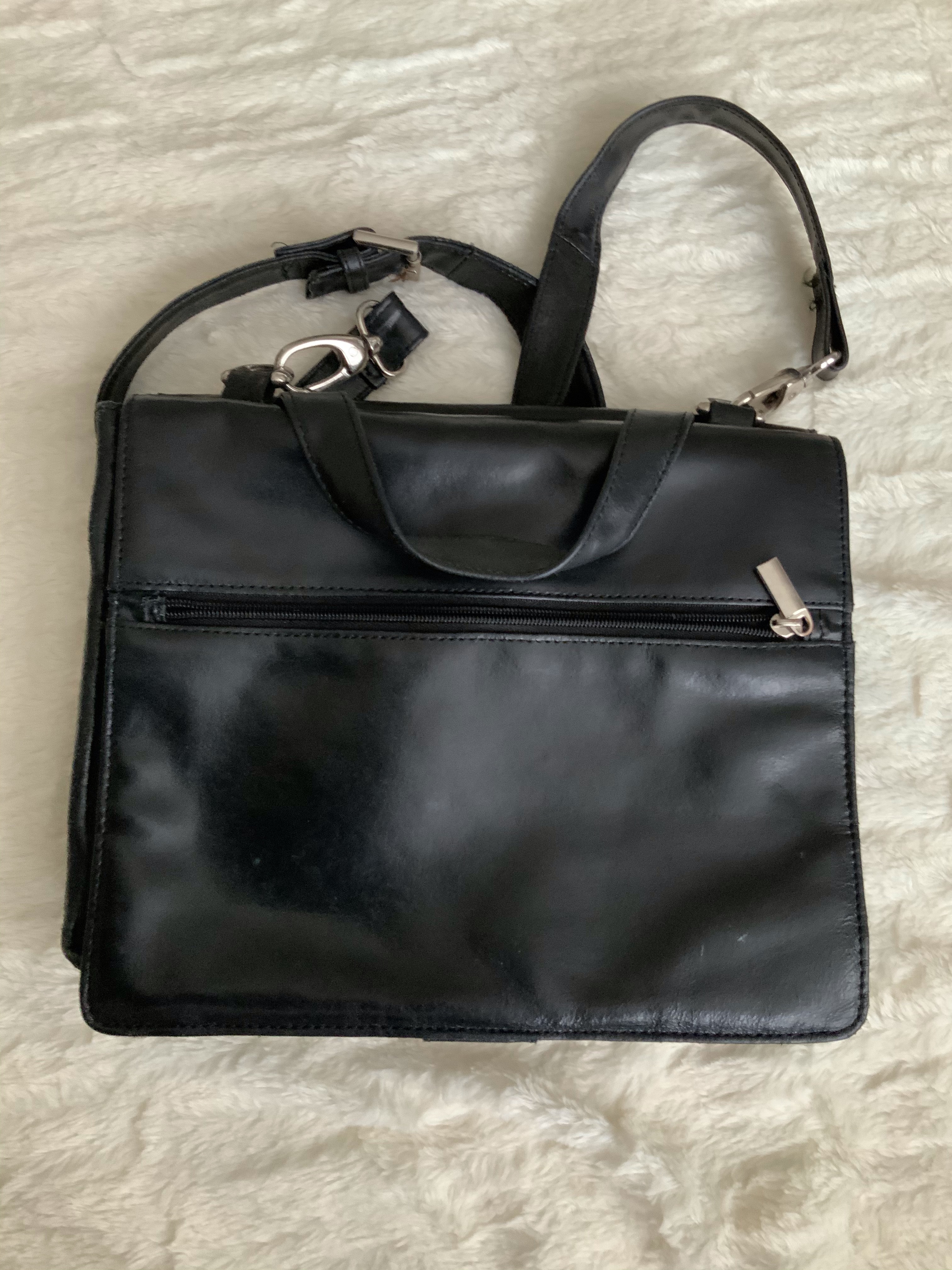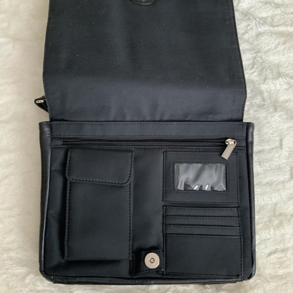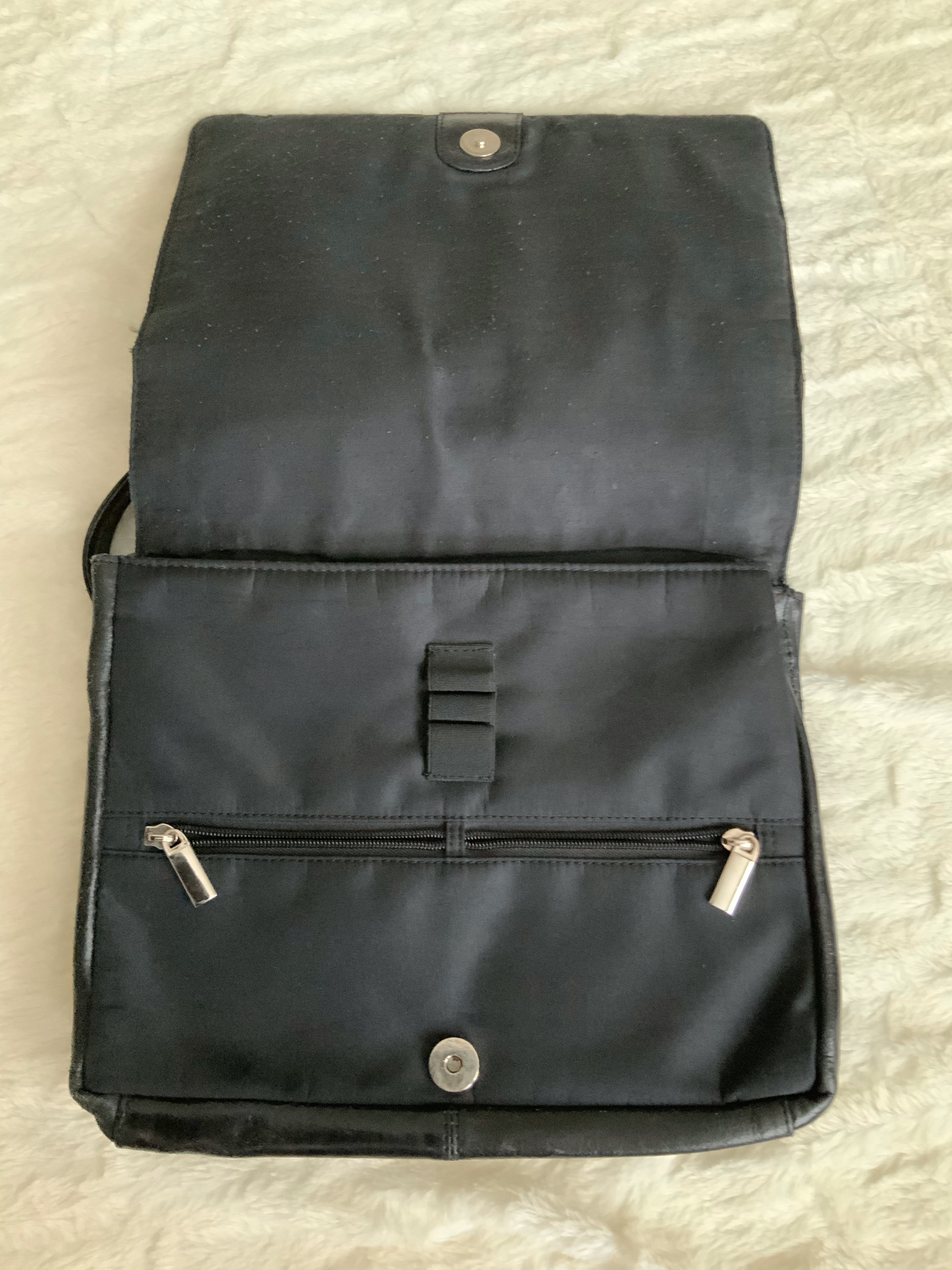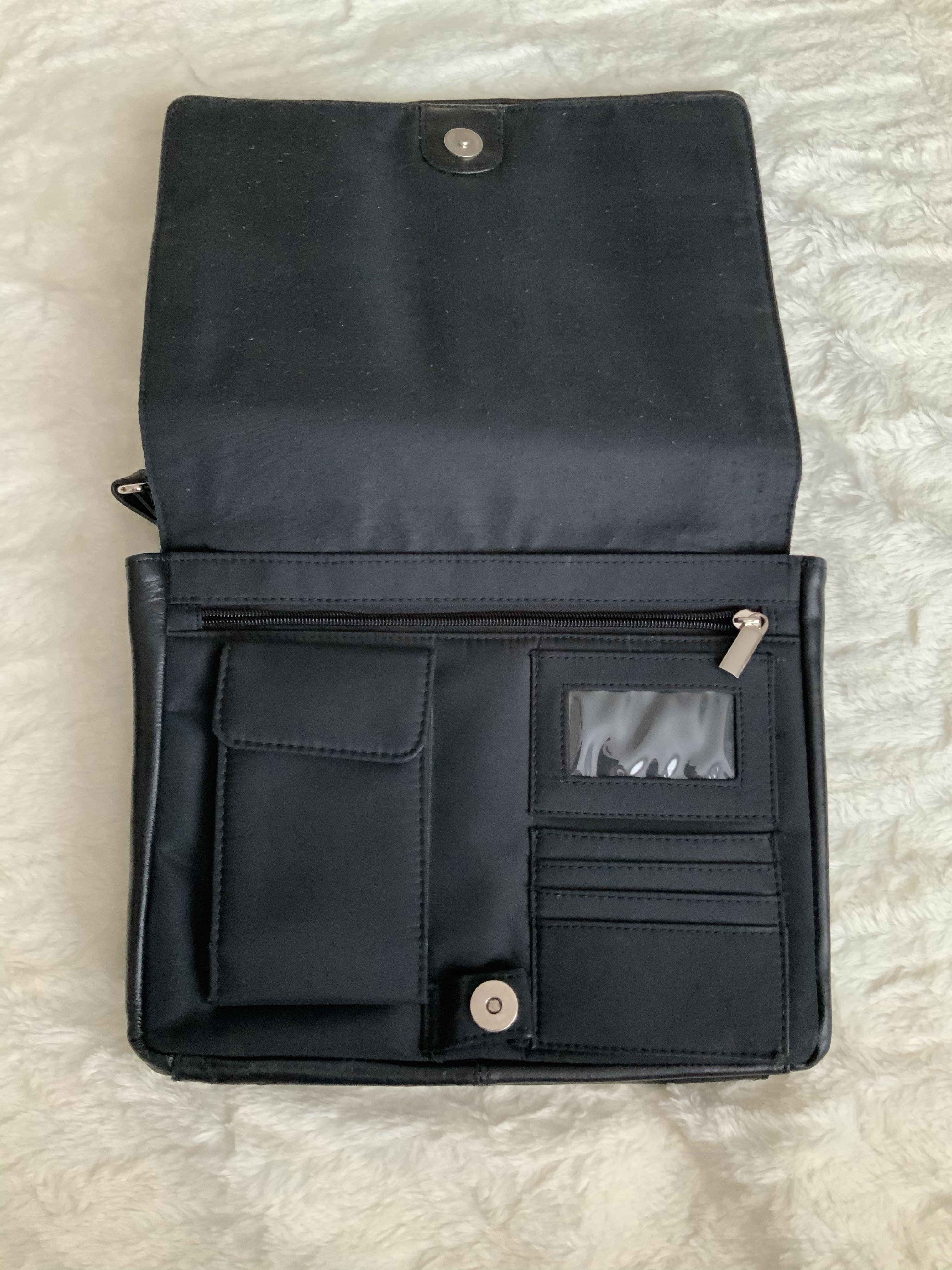 Wilson’s leather purse/bag. Both sides have flaps to reveal additional storage for pens, business cards etc. lots of room.