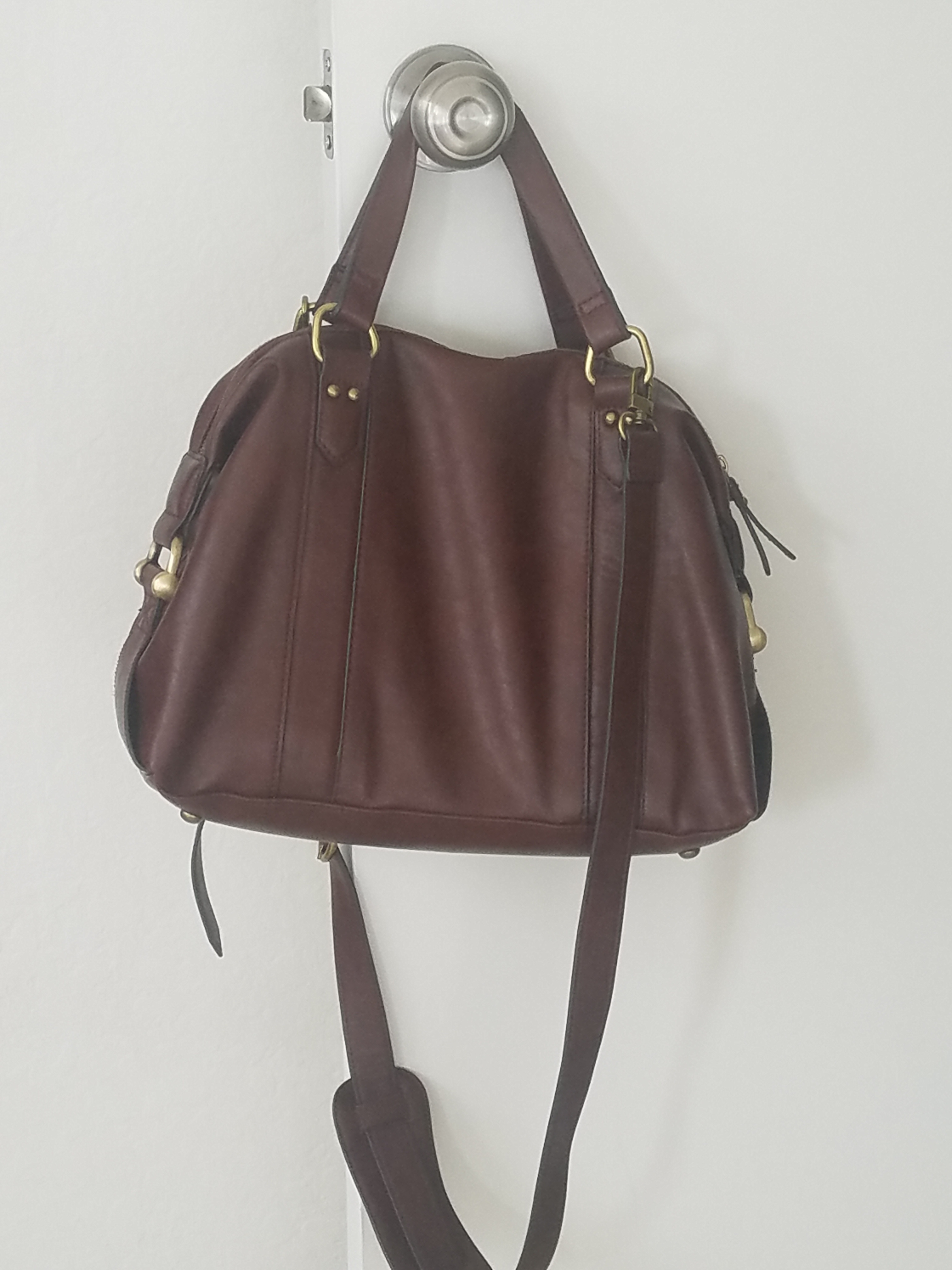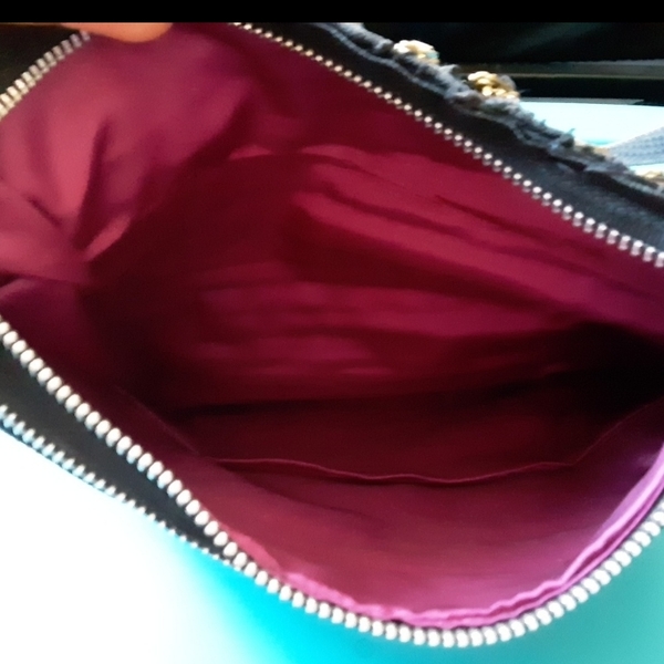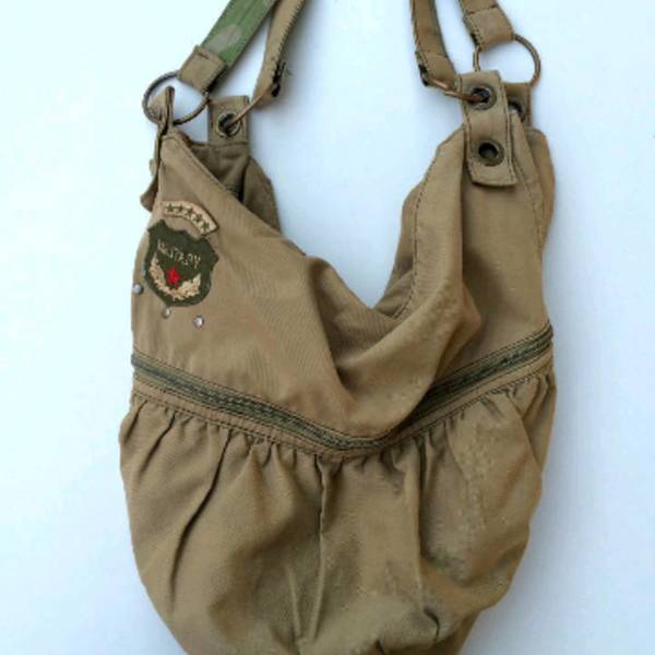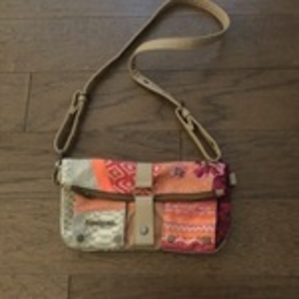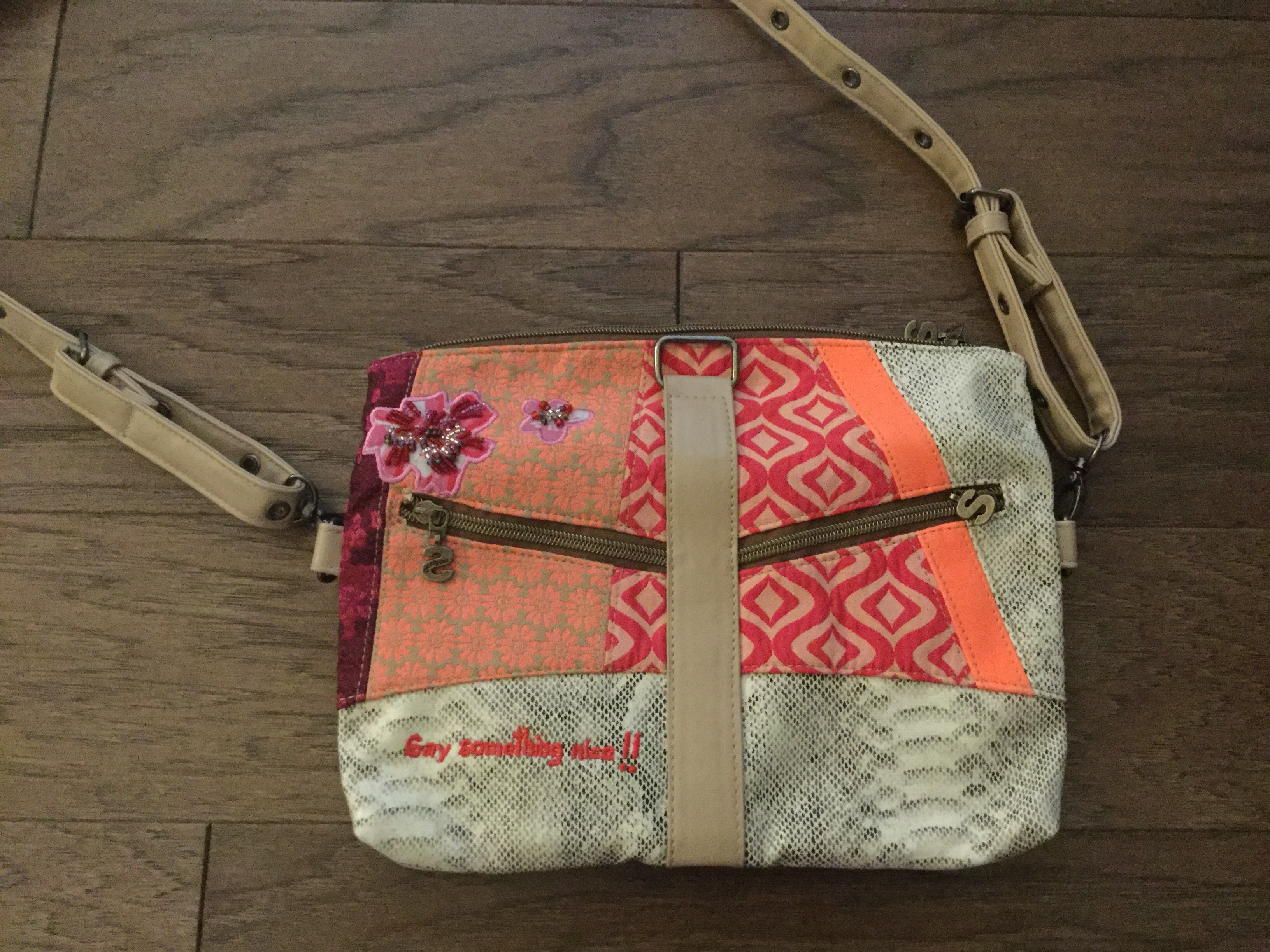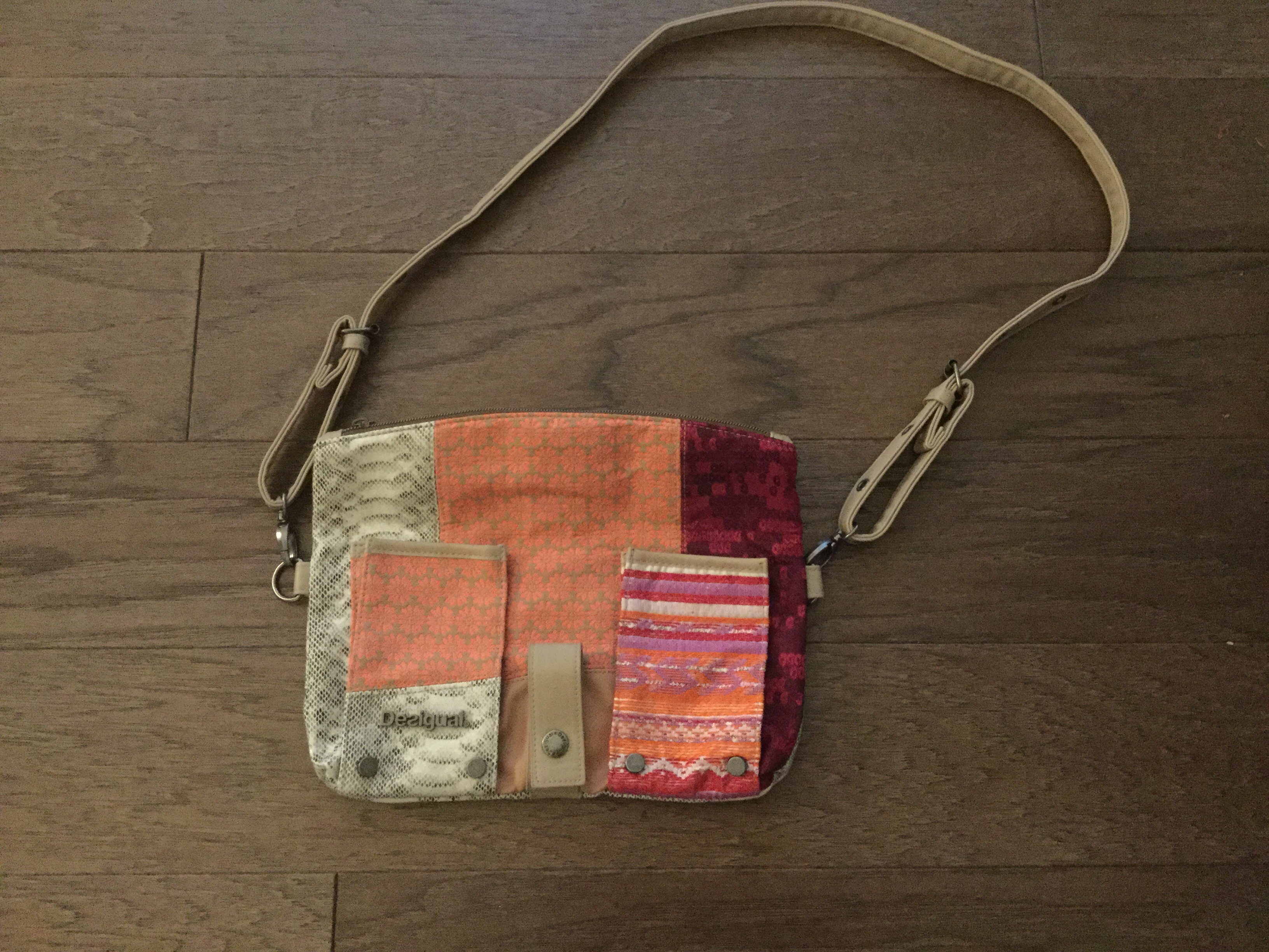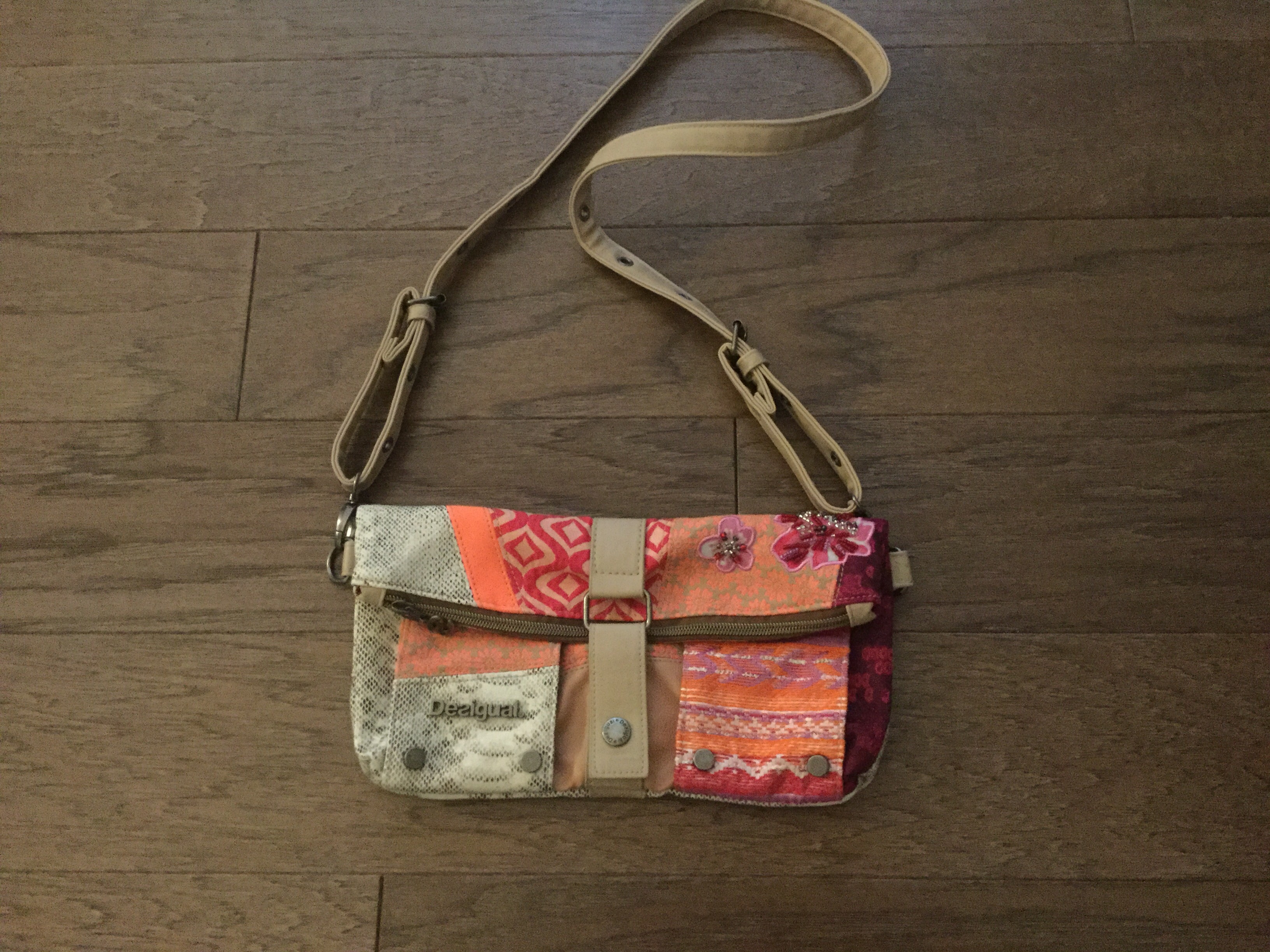 Desigual crossbody bag Measures 11 inches by 9 inches. Folds down to 11 inches by 6 inches. Just bought from Thredup website and it was not returnable. The photos made it look more like a messenger bag than a purse, I should have looked at the measurements. Paid 45$ would like something of same value. It is in excellent condion , I would say it hasn’t been used. The only flaw in a snag in the thread which I took a photo of.