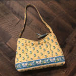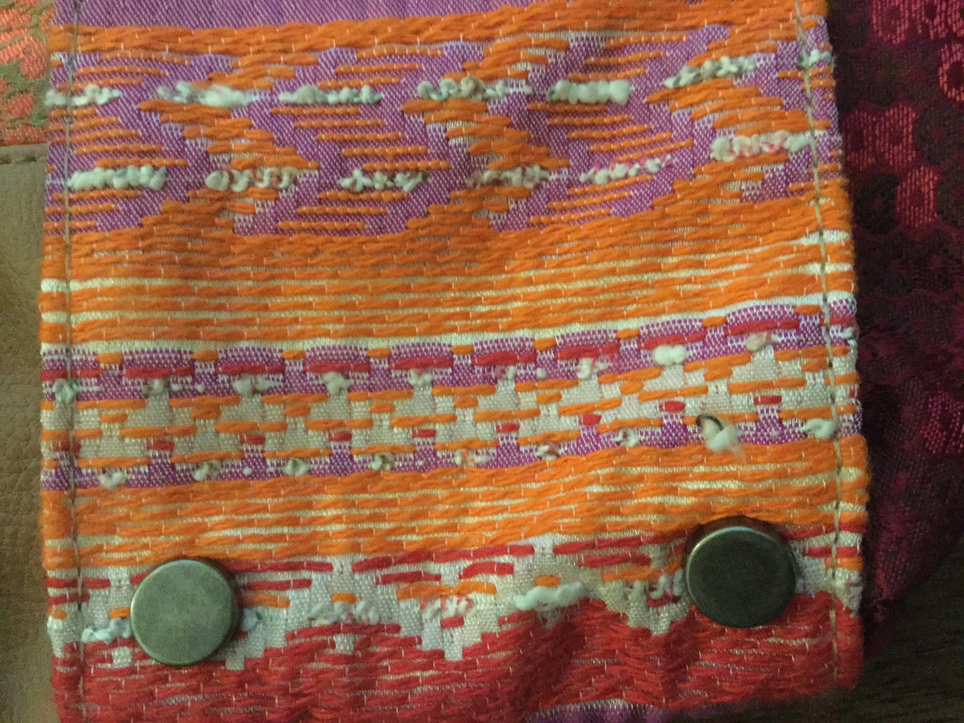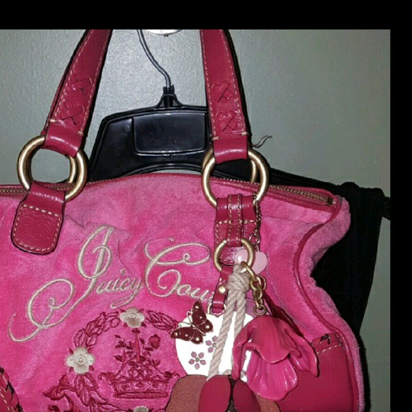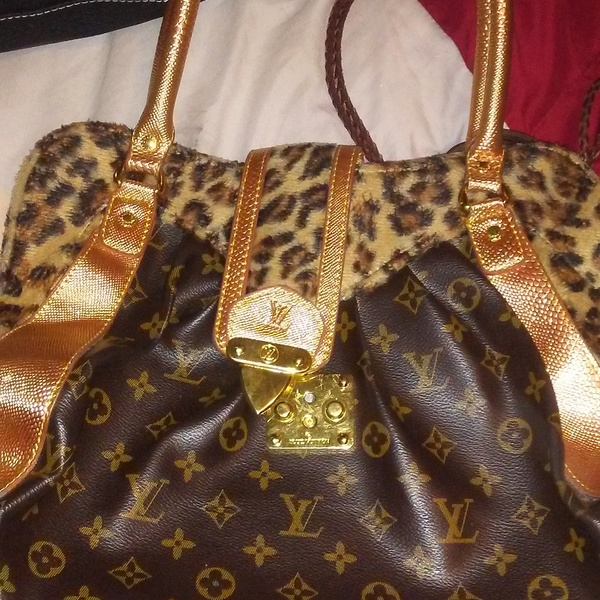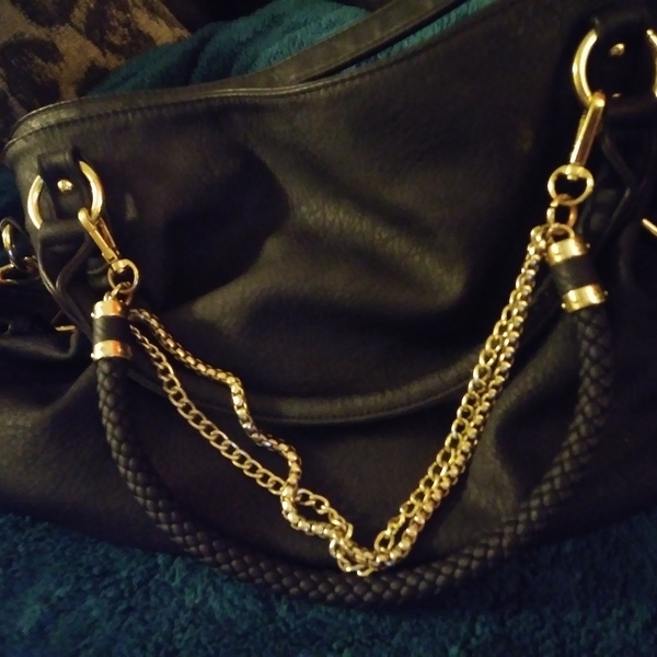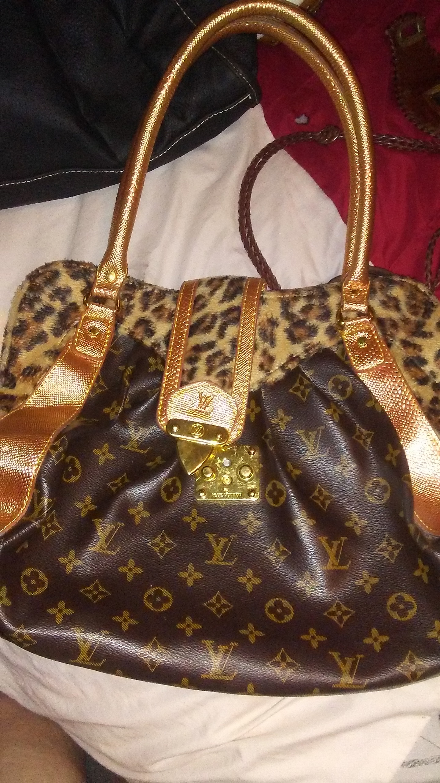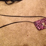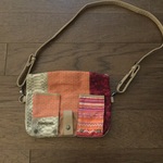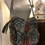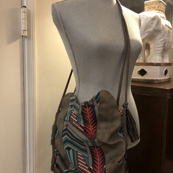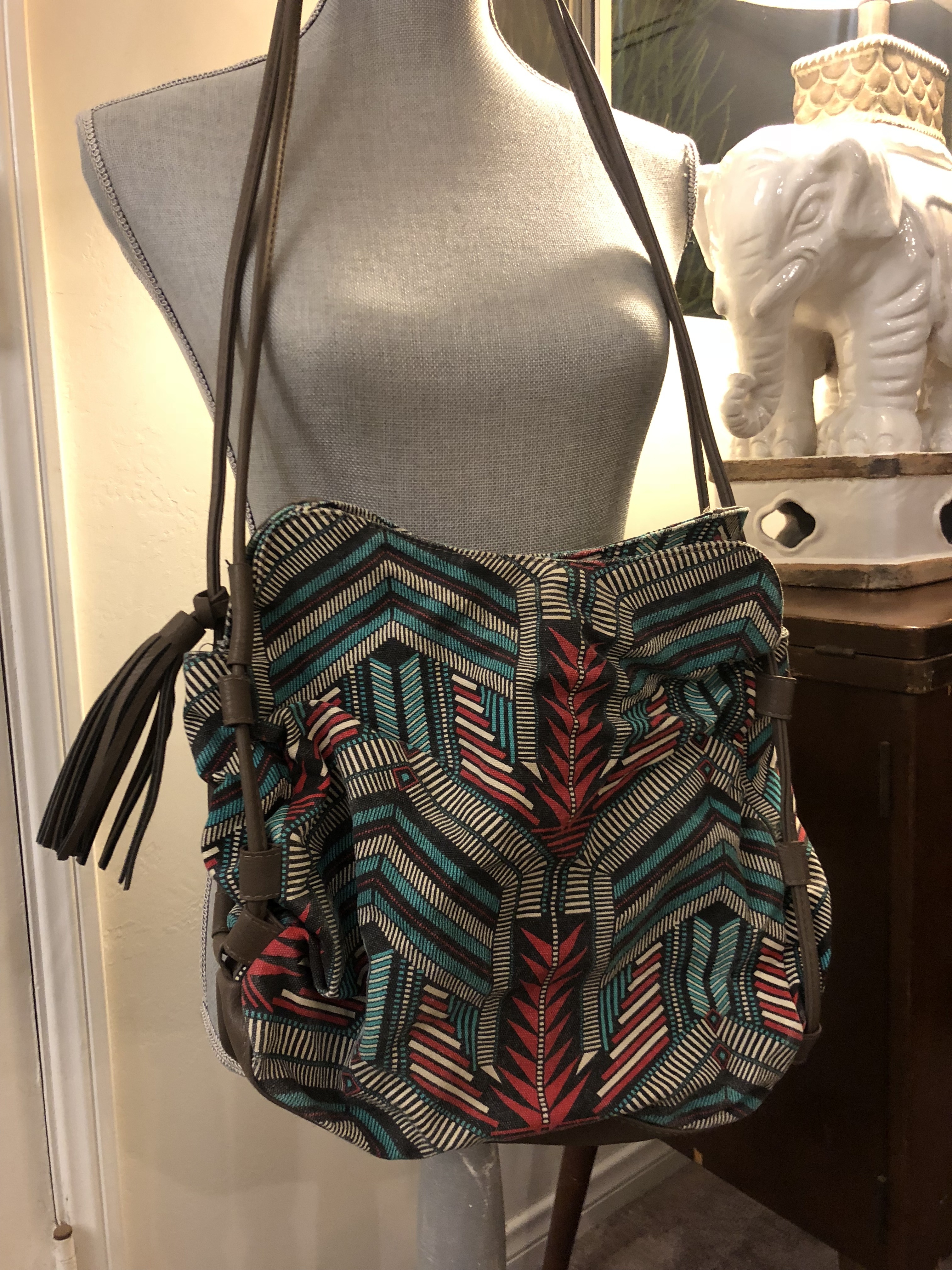 I love this purse. I used it for a season and now it deserves a new home. I love the colors. Leather parts are faux. Has one tassle and the purse kind of scrunches.