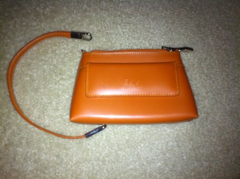 Purchased this Beijo Date Night bag at a demonstration. Has great tangerine/orange patent leather finish. Can be worn as a clutch or with short strap. Be aware that this bag is small. 6.75″ L x 1.75″ W x 4″ H according to the Beijo website. It has a faint scuff mark on the front. Other than that, this bag has been used once and looks like it.