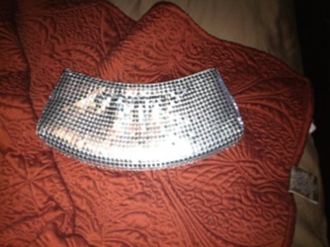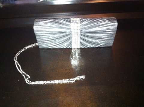 Used once for prom, this clutch is a silky grey material with a band of rhinestones down the center and an optional metal link strap. Purchased from Charming Charlie.