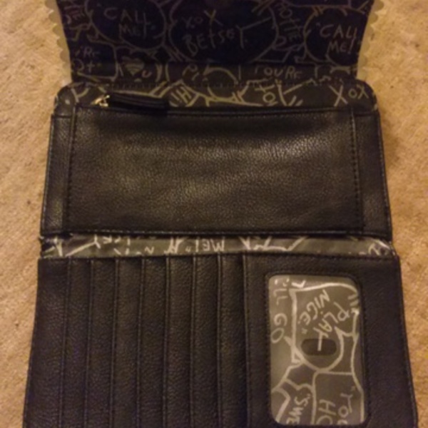 Good condition by: Betsey Johnson. Piano style wallet, colors black, silver, and white. Zip up coin area, and bills sit flat inside. Graffiti style inside, and enough compartments to hold cards etc.