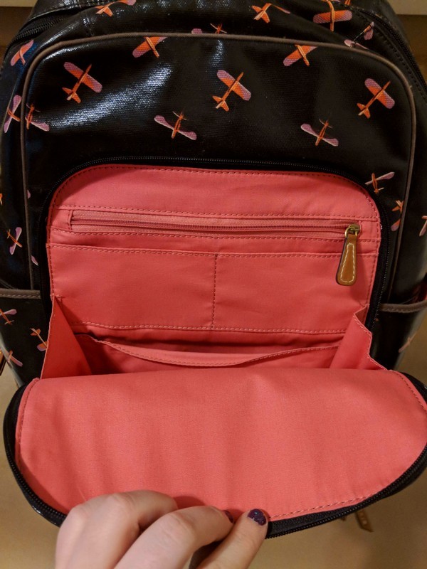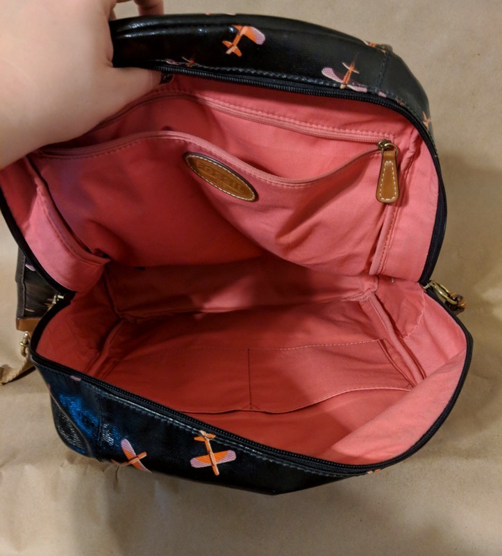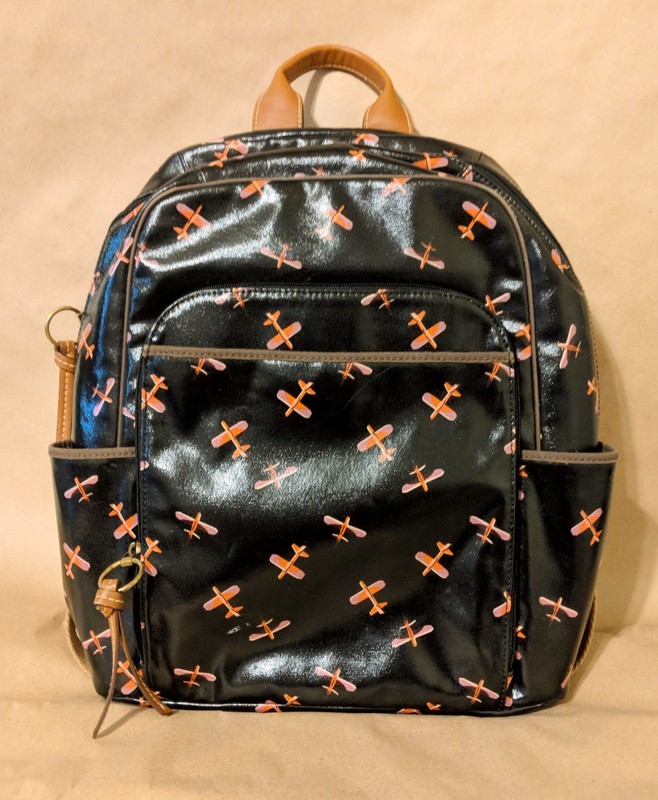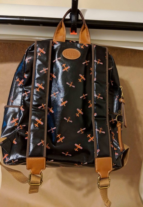 A very cool authentic Fossil Backpack. Pockets on both the outside to hold your drinks, a small pocket on the front that has many smaller ones on the inside. Big pocket is large enough for a small Laptop and some books (I uses this for a while in college) along with several more pickets. This is great for someone who likes to be organized. The shiny fabric makes it easy to keep clean. It is used and there are normal wear and tear on there, but it's still is superb shape. There is a small spot in the bottom left-hand corner of the front that is damaged. You can see it in the photograph. But if you would like a better photograph I be happy to send it to you, along with any other pictures you would like. There are no pen marks on the inside, and the spot on the front is the only major, or noticeable blemish.
