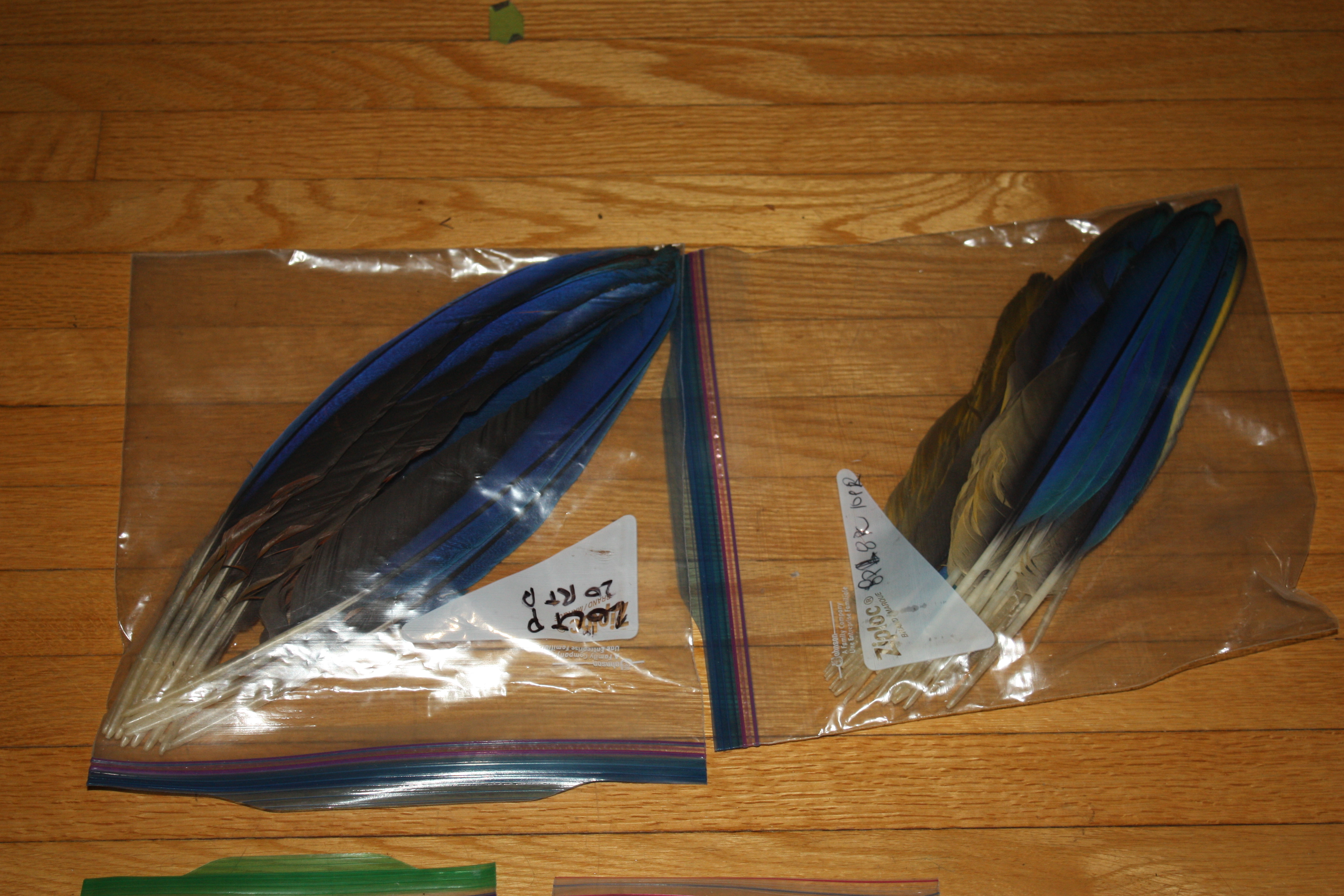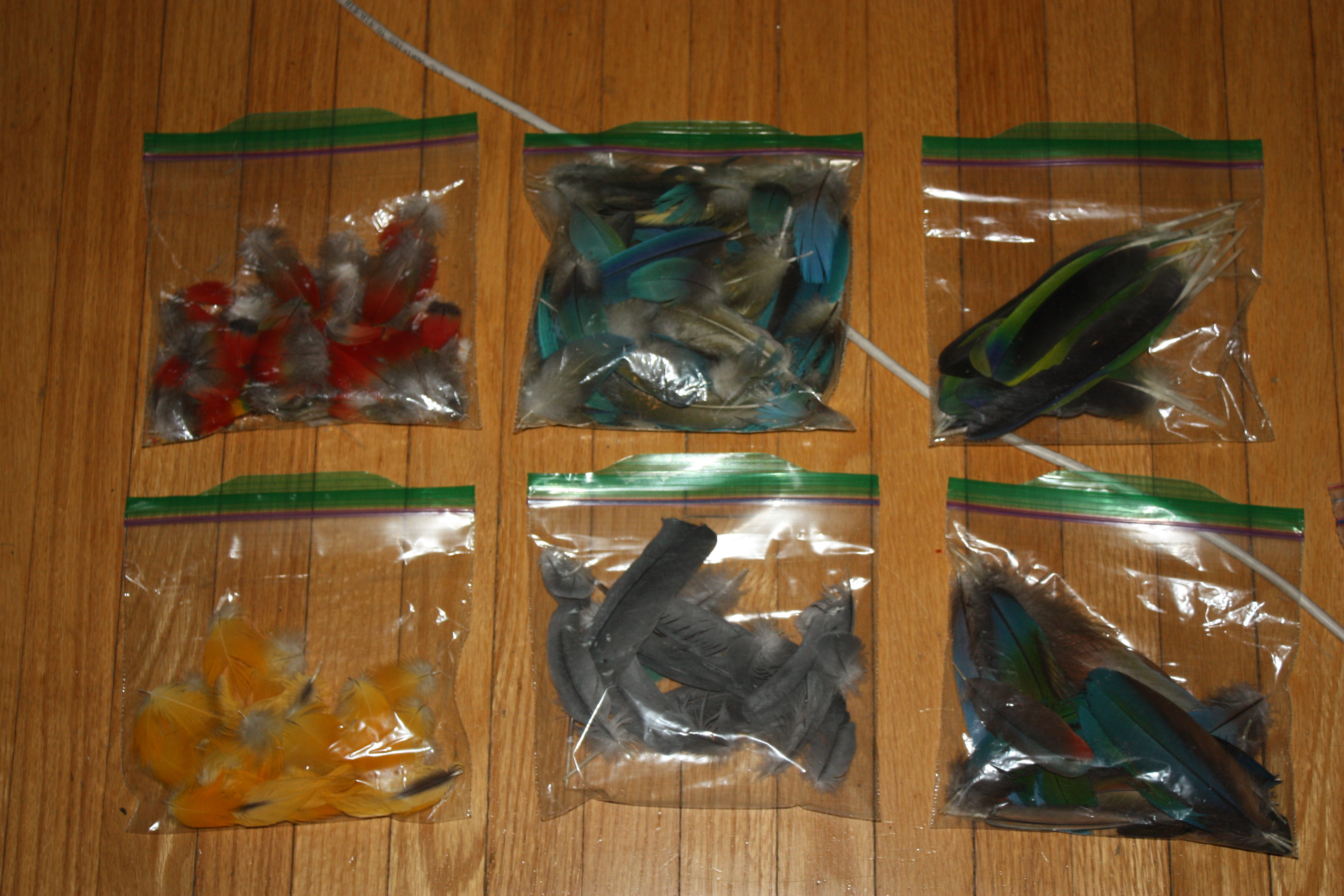 Natural cruelty free bird feathers Mixed small down feathers and or primary/secondary feathers. I have blue & gold macaw, scarlet macaw, amazon, and African grey feathers. Please answer ad with quantity and color. Great for making homemade earrings, necklace, costumes, dream catchers, etc. Money earned buys food and toys for our birds. Able to ship in needed. Separated small feathers by species and color.