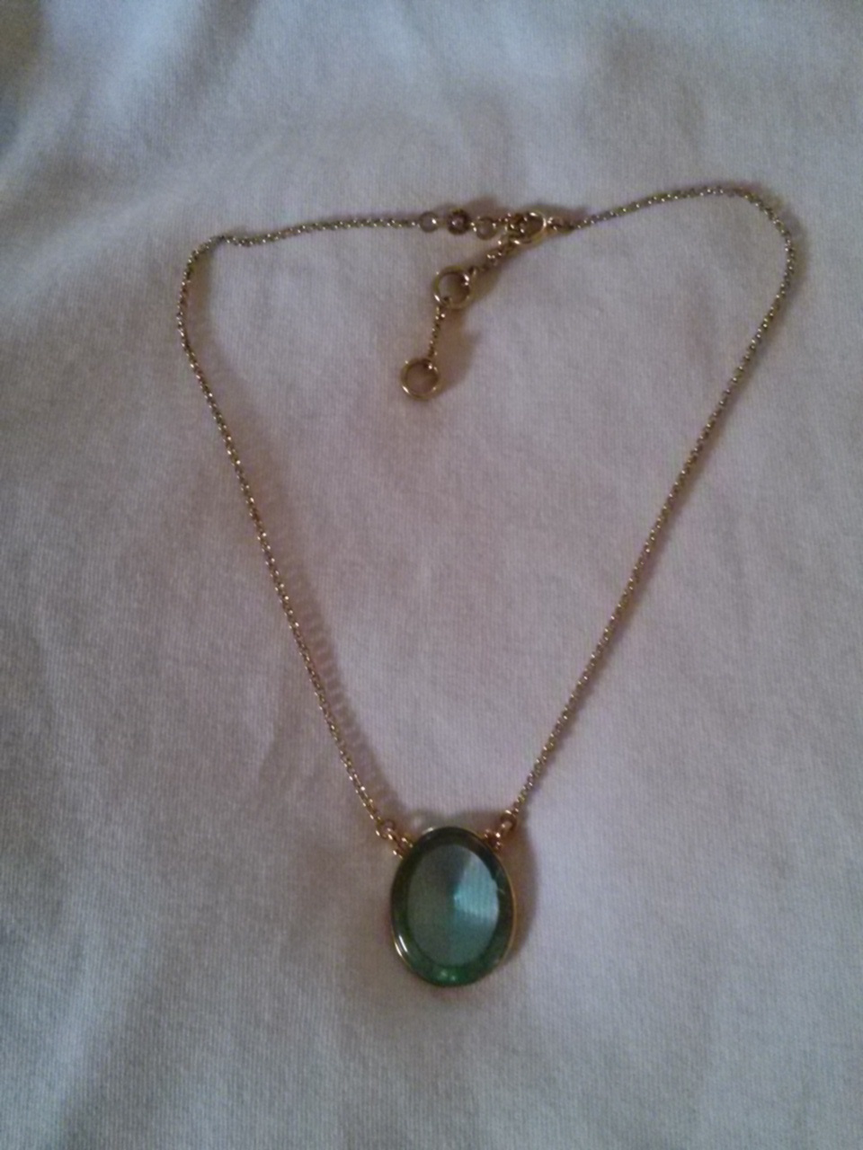 Pale green glass oval is faceted on the back, rounded on the front, set in a gold-tone oval ring. Slinky round gold-tone chain adjusts from 15.5" to 17" with post-and-ring links. Color of the glass is affected by the color under it, different with every outfit you wear. Comfortable to wear, has weight without feeling heavy.