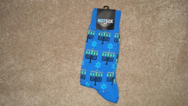 These are a pair of men's socks, brand new, unopened package that have a blue background and on them are Chanukah Menorahs and Stars. They are machine washable in cold water and are 50% cottotn, 30% polyester, 18% nylon and 2% spandex. They fit shoe size 6 to 12-1/2.