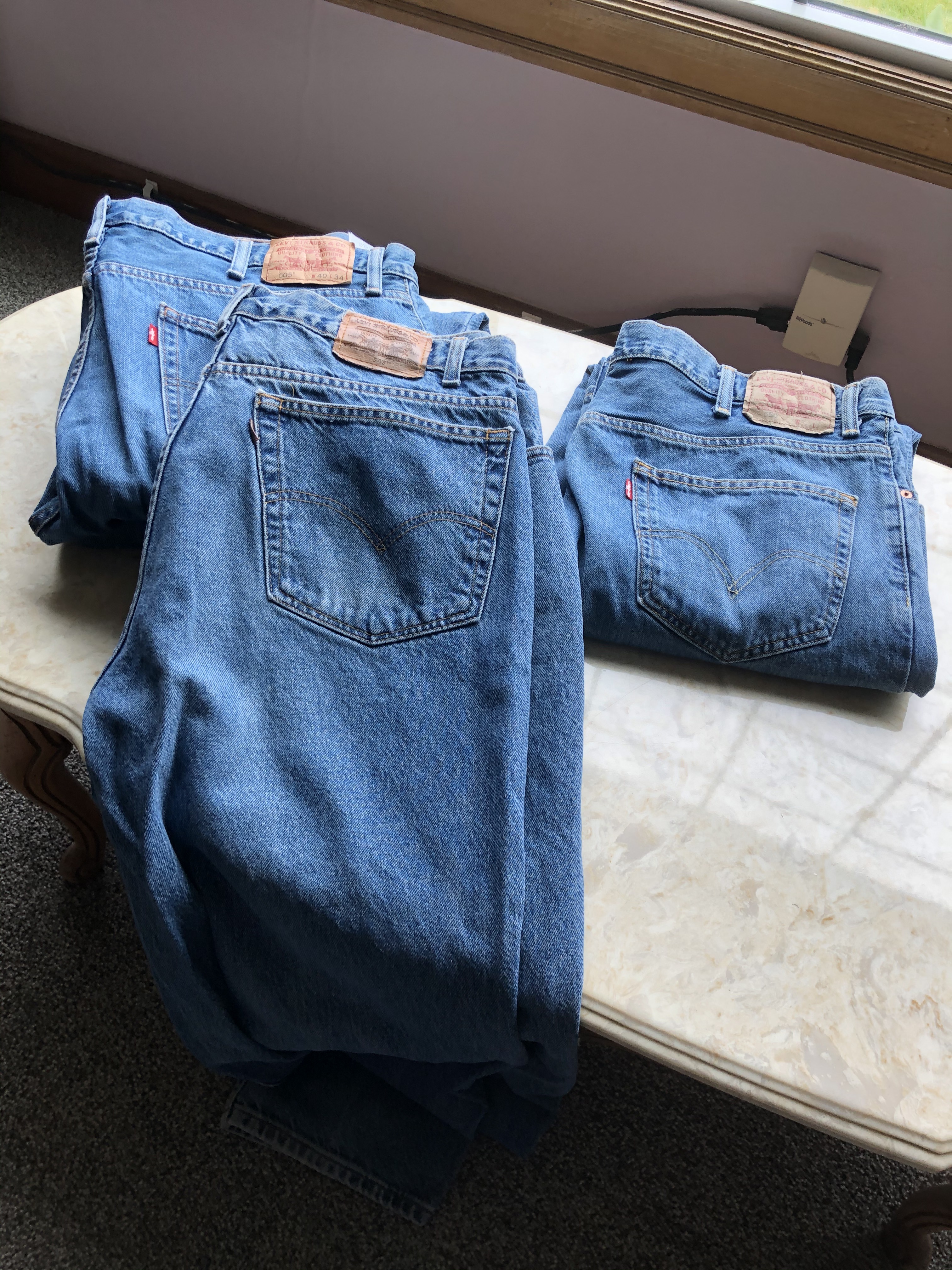 Levi Strauss jeans for sale. $20 each. One style is 505 (straight fit)-it is 40 inch waist by 34 inch length. One style is 545 (loose fit)-it is 40 inch waist by 36 inch length. Two styles are 550s (relaxed fit)-both are 40 inch waist and one is 36 inch length, the other is 38 inch length.