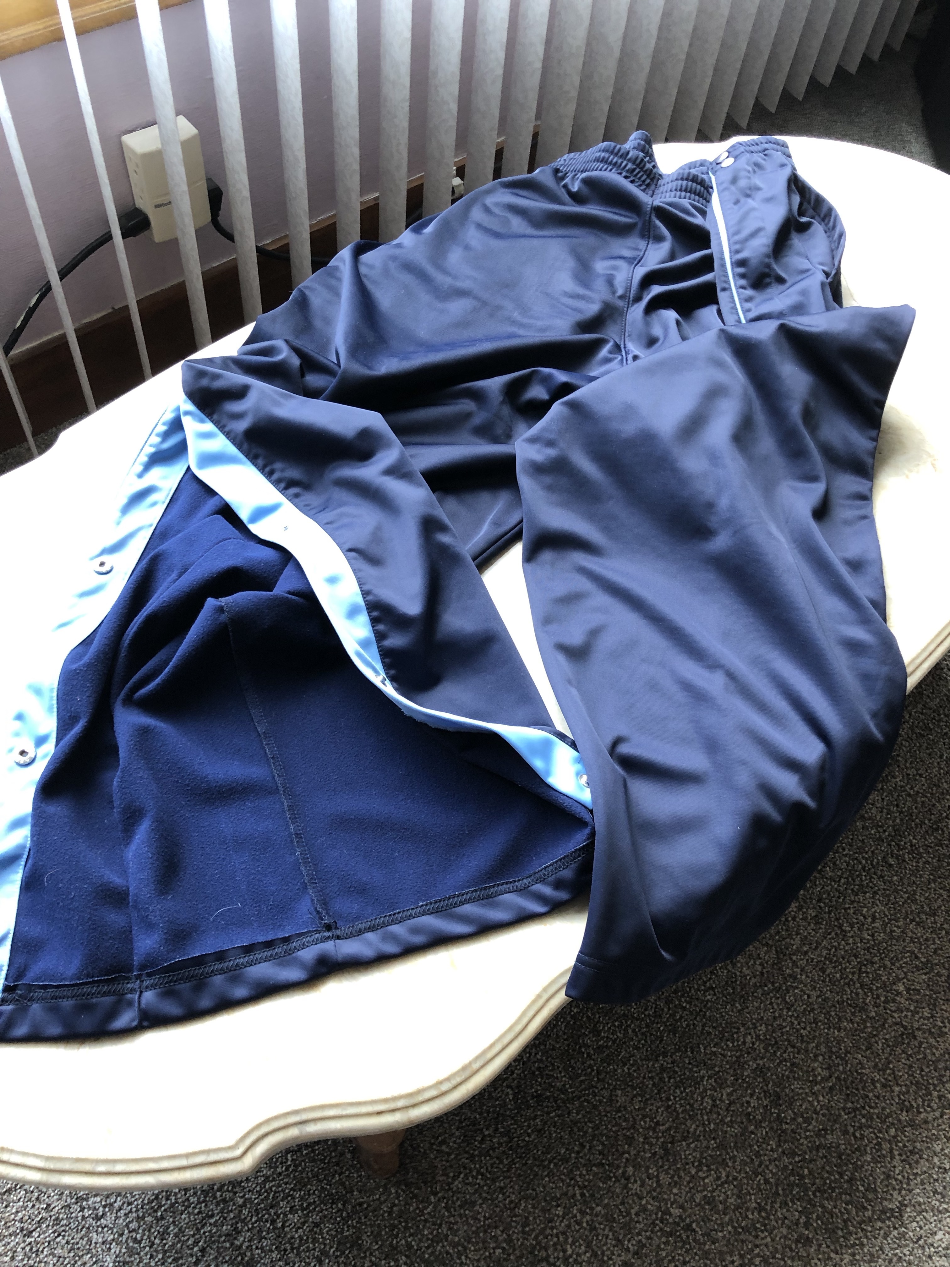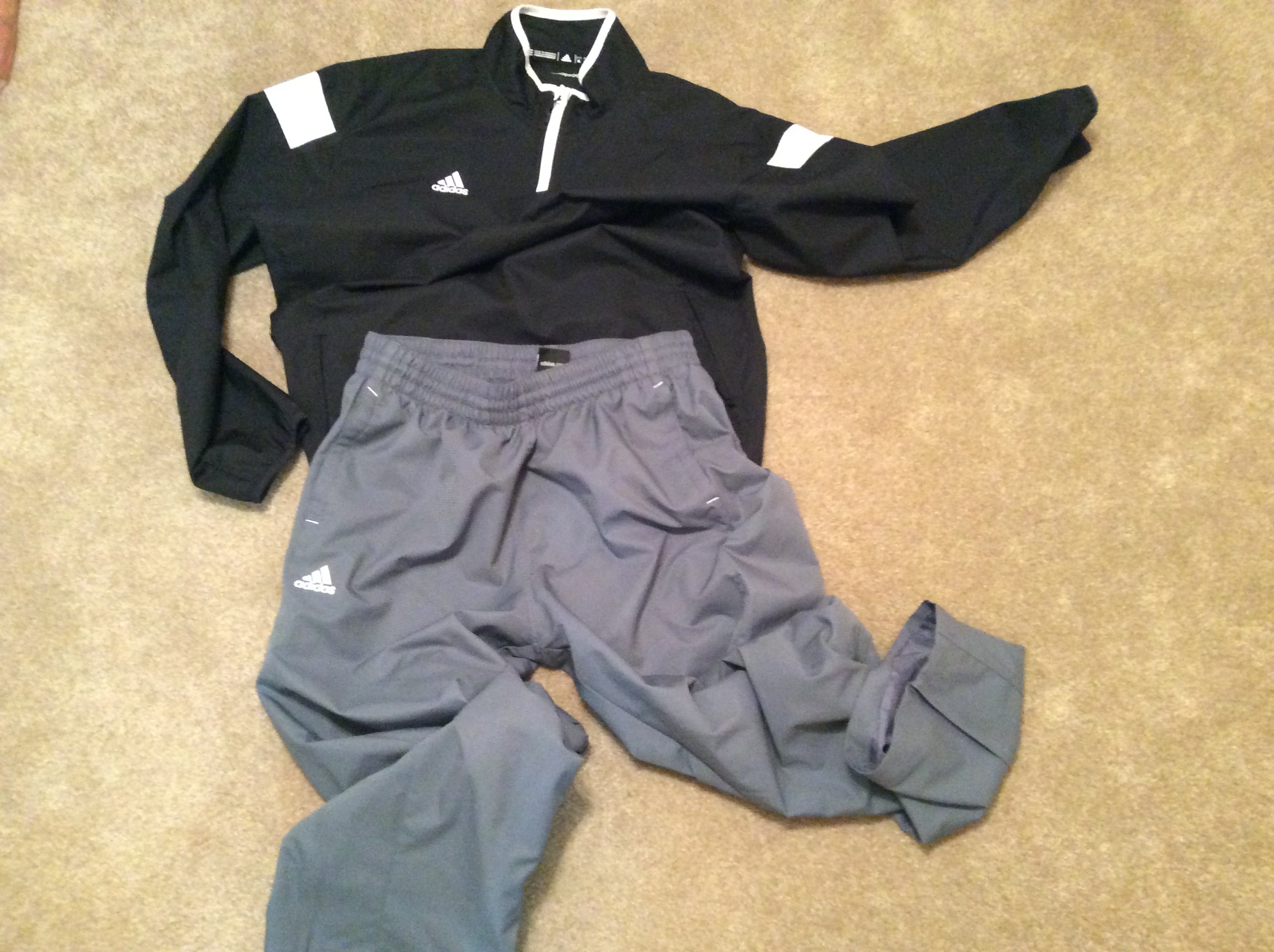 Has green and red stripes on the sides of both the hoodie and pants the hoodie doesn’t have strings but the pants do also the pants have some lint in them