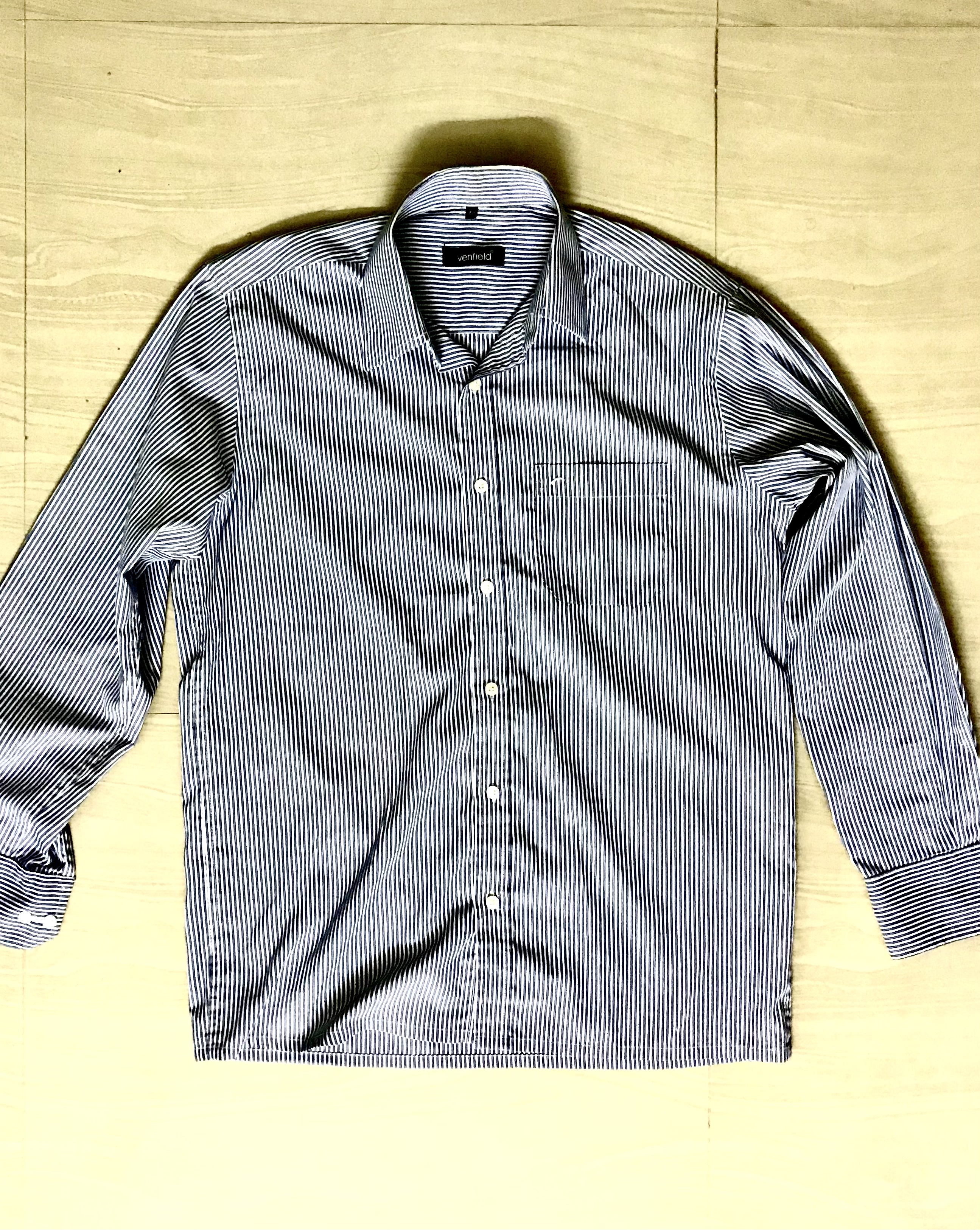 This is a button up black dress t-shirt with black race stripe accents down one side. Nicely fitted. Brand name is ZOOM