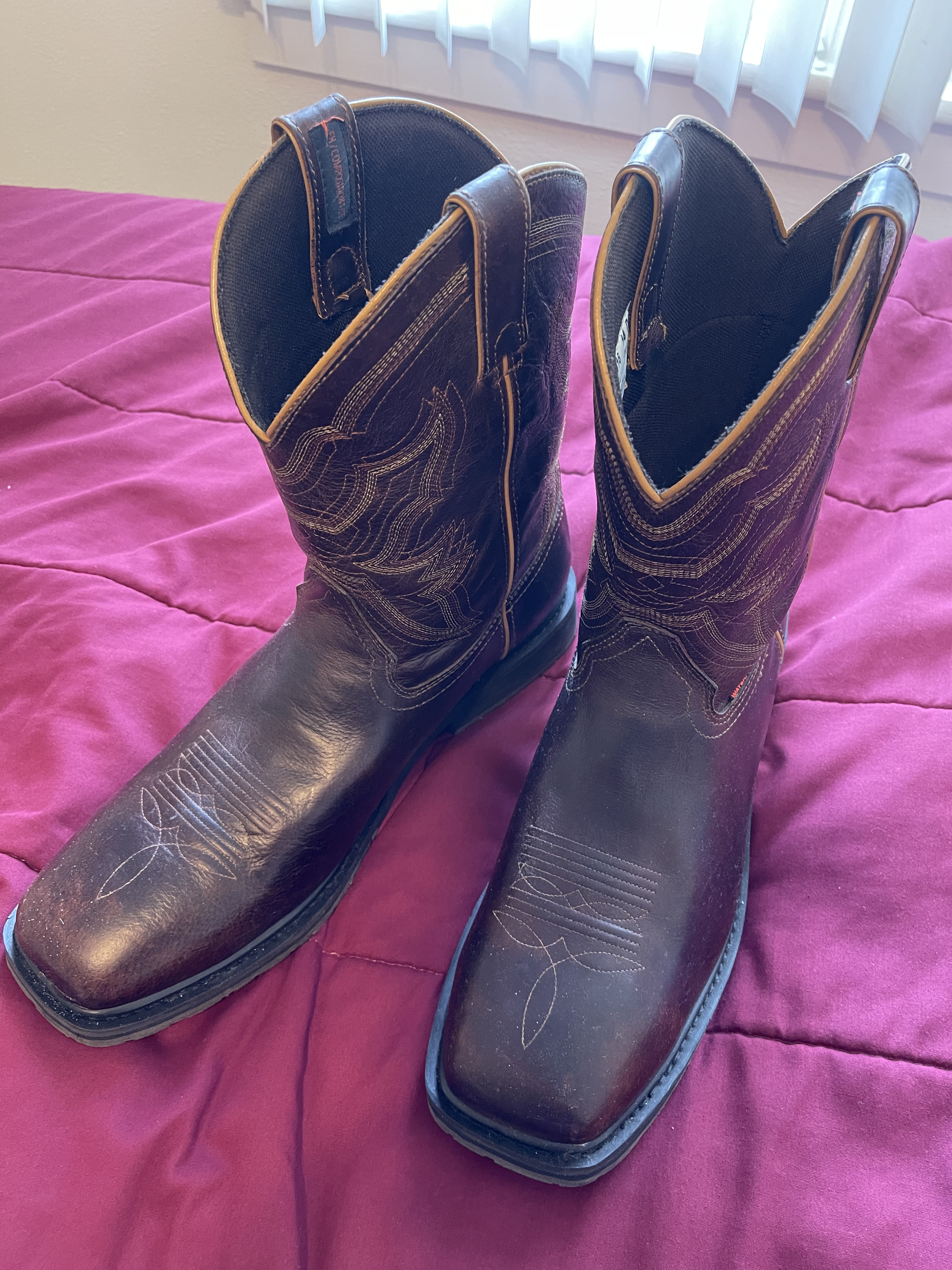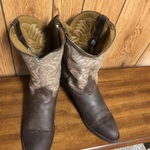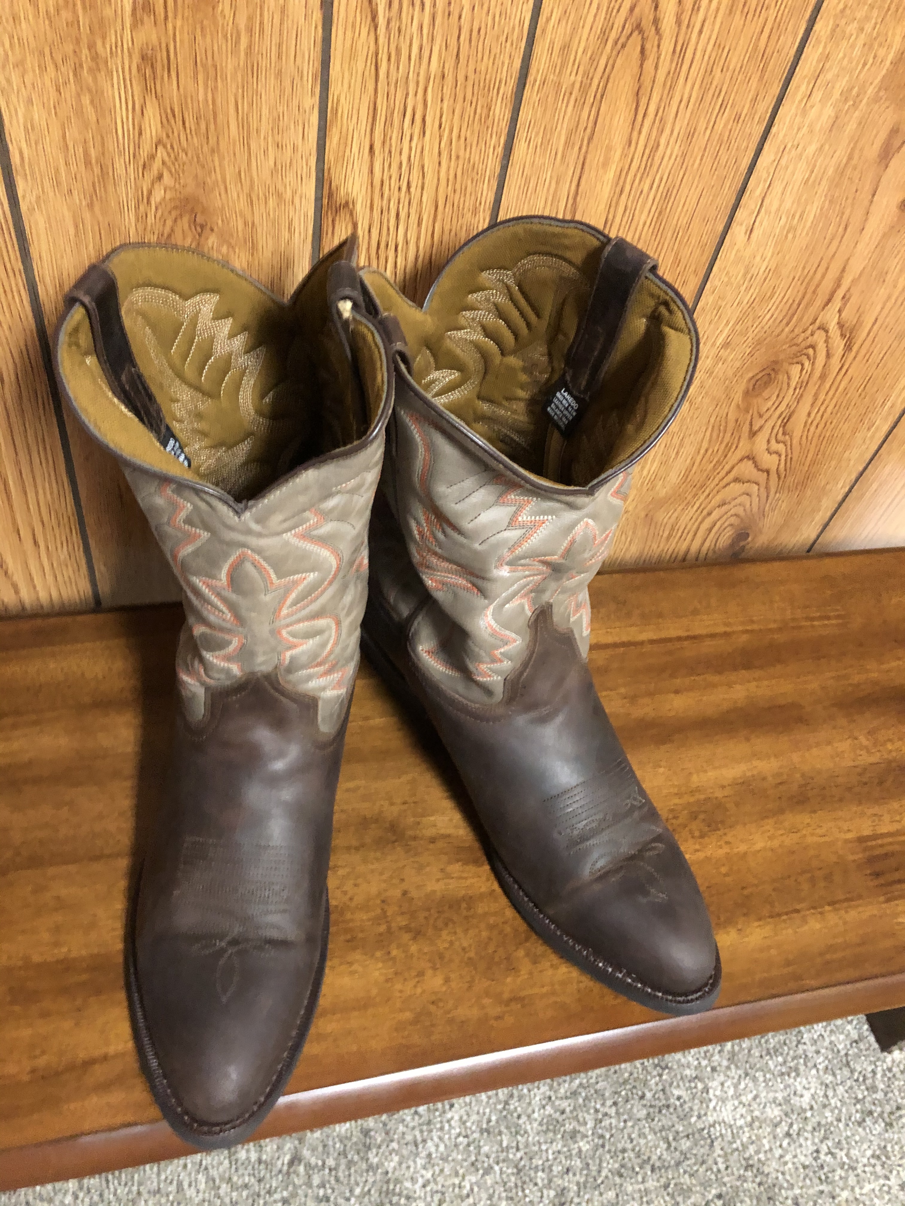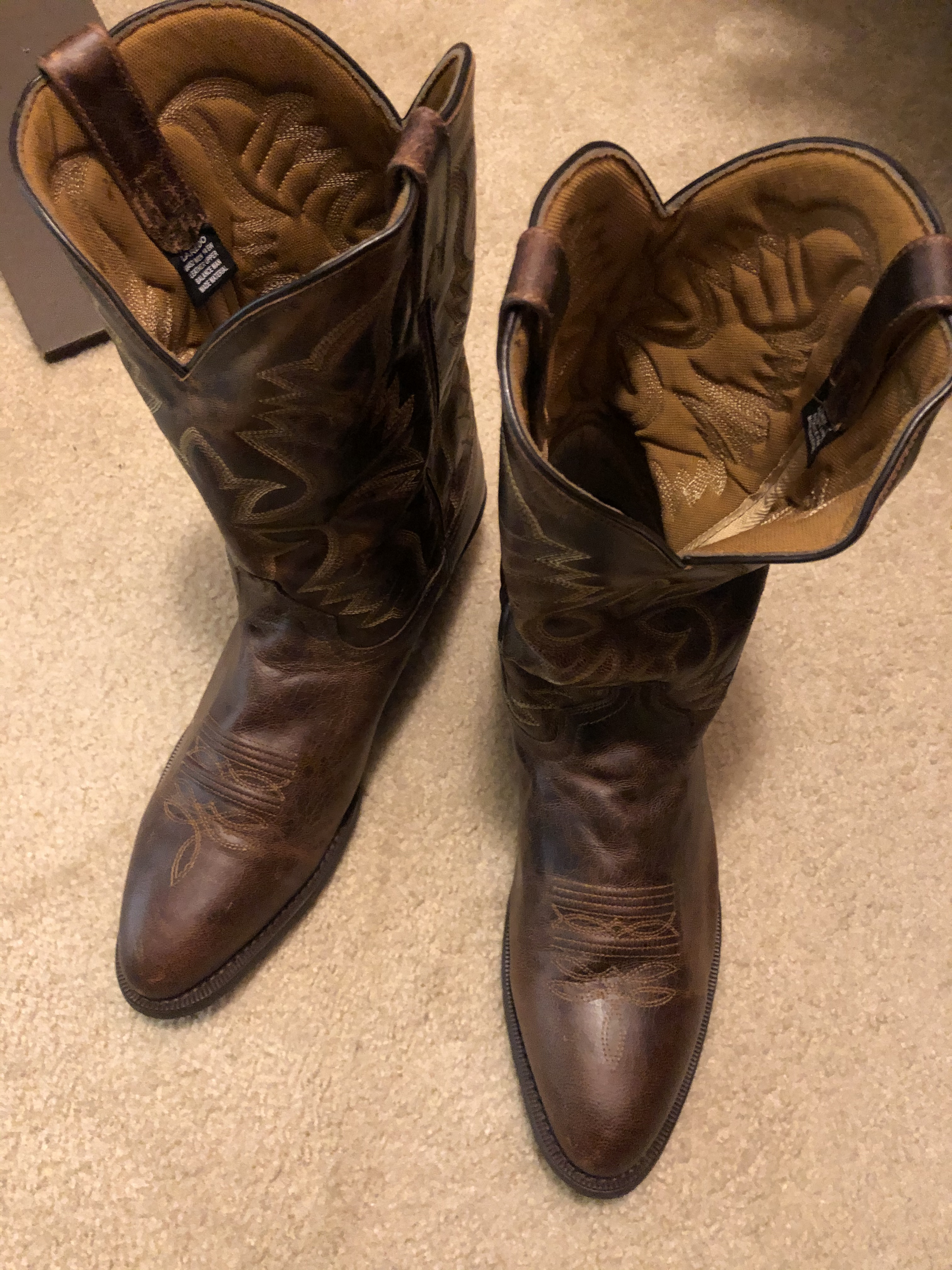 Fort Frontier® brown Nebraskan Mule Ear Shooter boots style #LEM400 for sale. They have rounded, square toes and an 18” shaft by a 17” circumference. The heel is 1.5” high in a “cowboy” style. They also have goodyear welt and a leather lining. Size 15D. Original box available on request. In very good shape, have only been worn a few times. $90 or best offer.