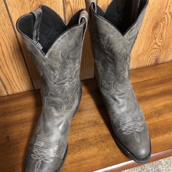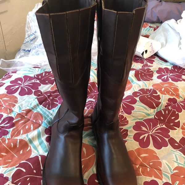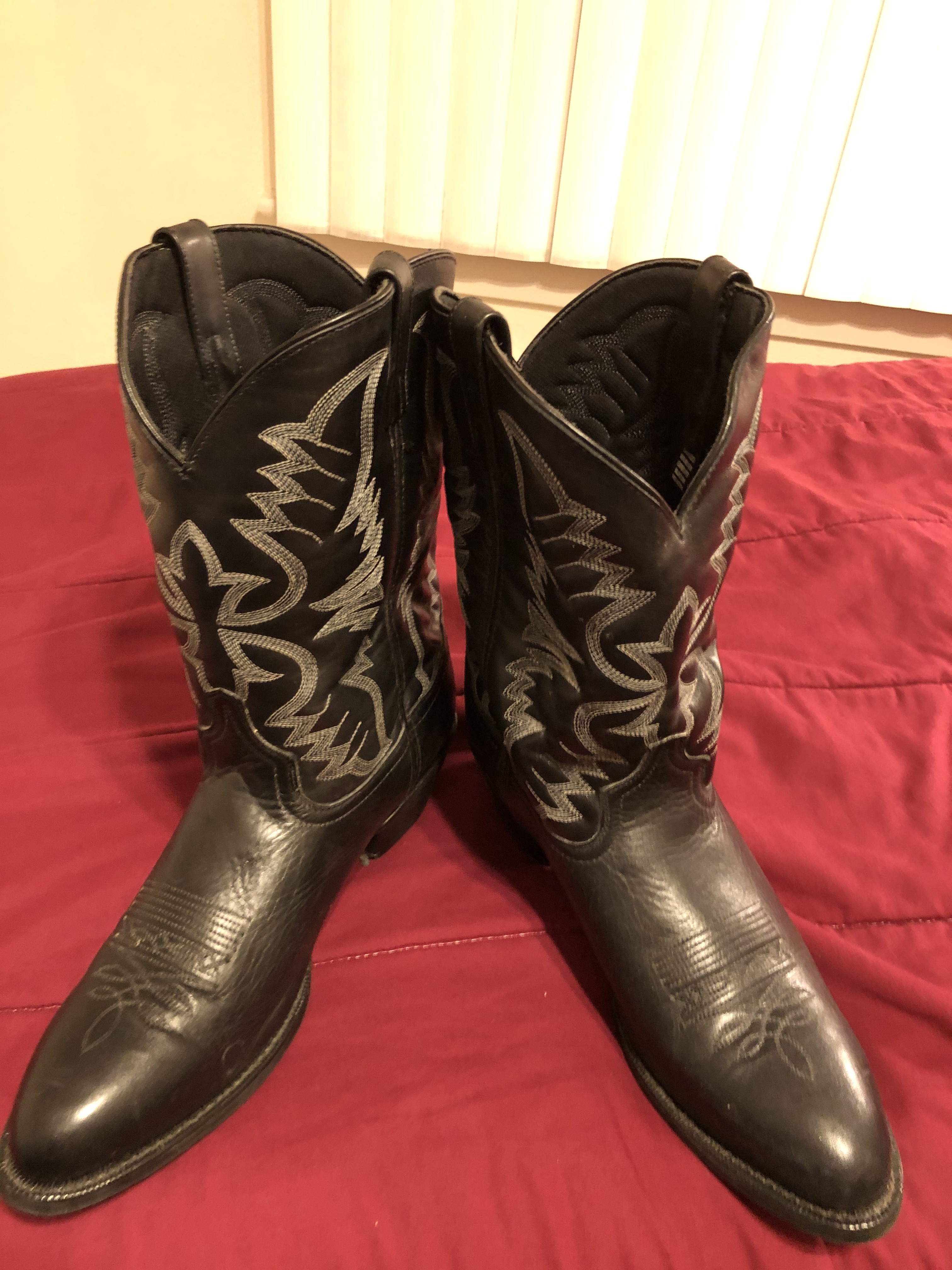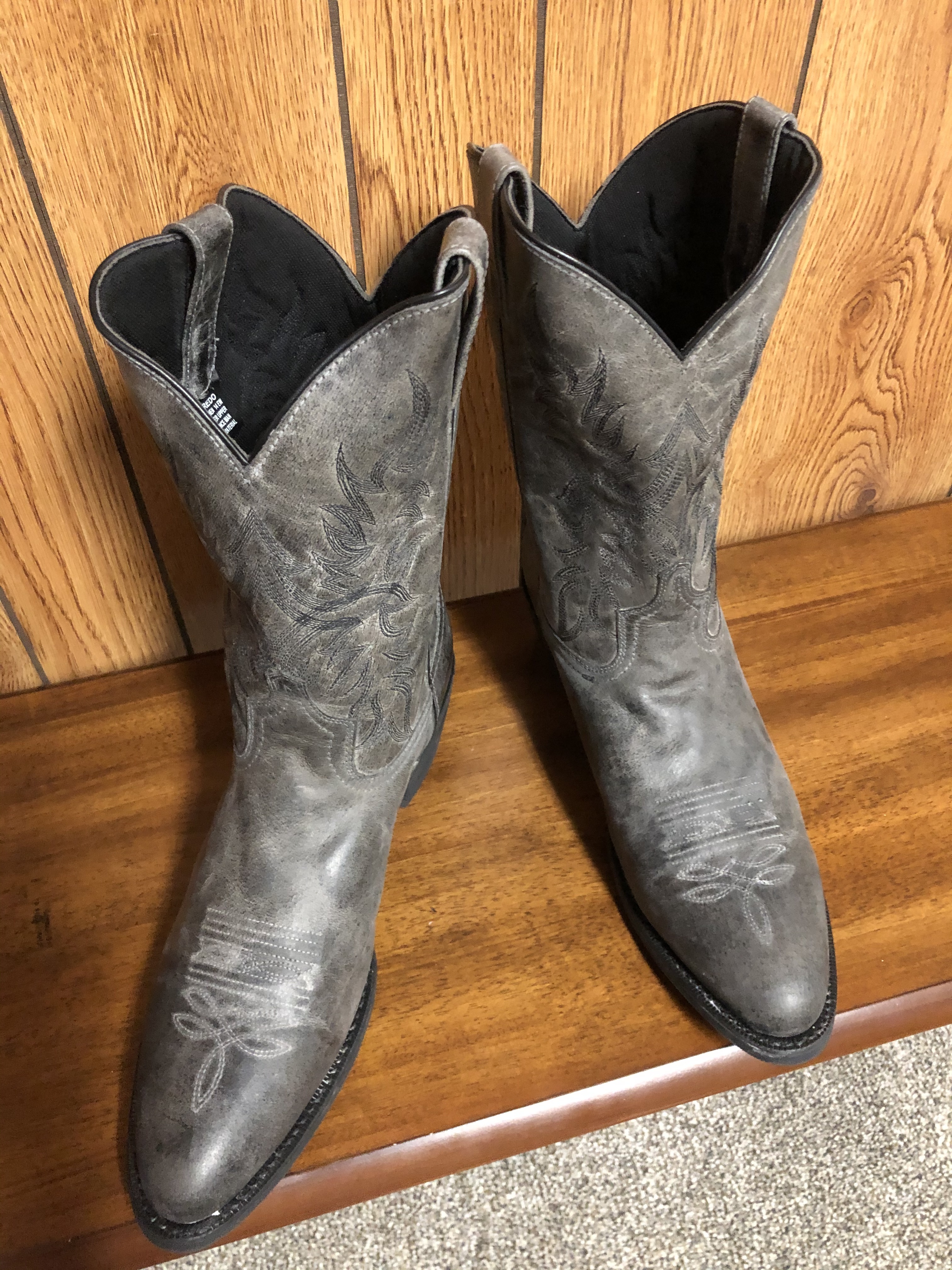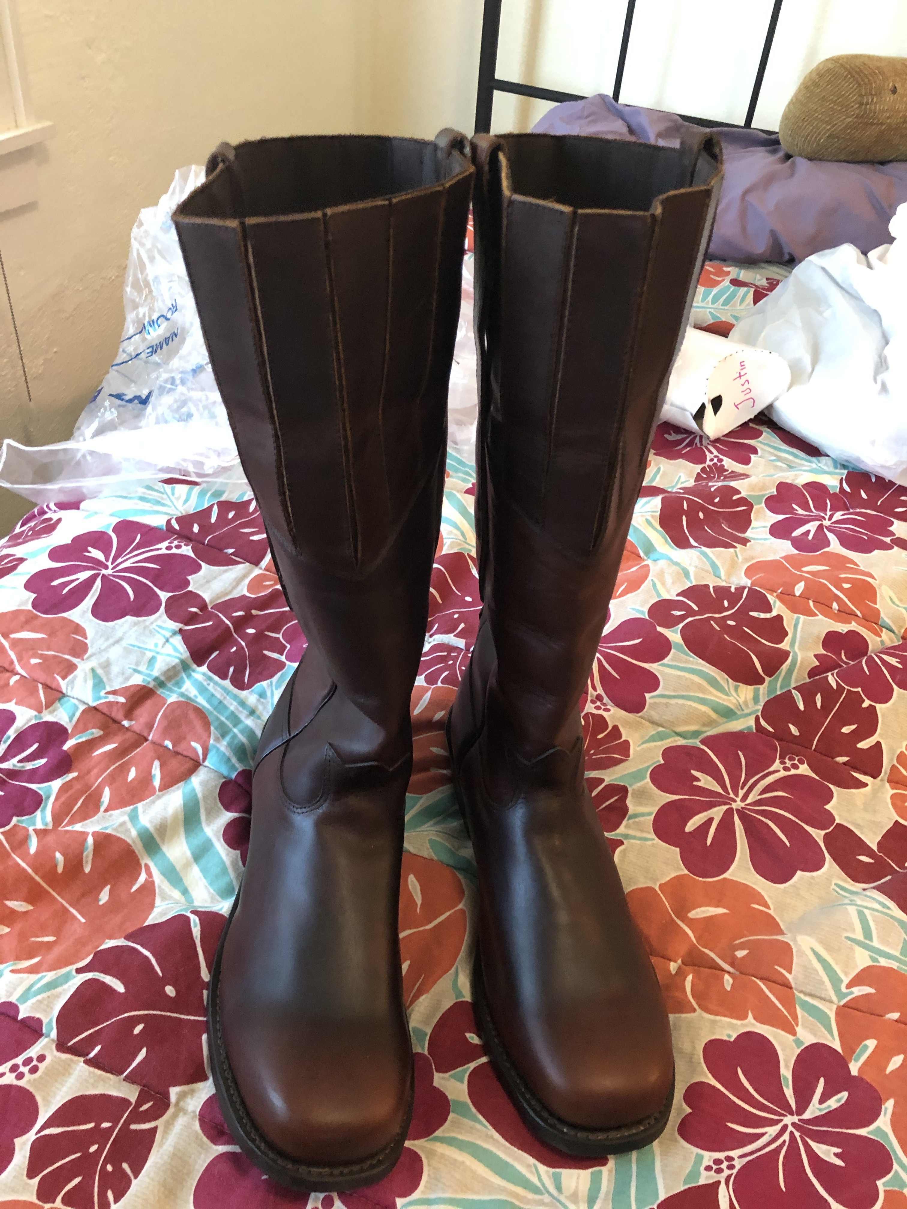 Fort Frontier® brown Nebraskan Mule Ear Shooter boots style #LEM400 for sale. They have rounded, square toes and an 18” shaft by a 17” circumference. The heel is 1.5” high in a “cowboy” style. They also have goodyear welt and a leather lining. Size 15D. Original box available on request. In very good shape, have only been worn a few times. $90 or best offer.