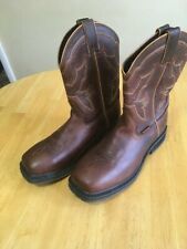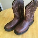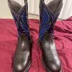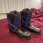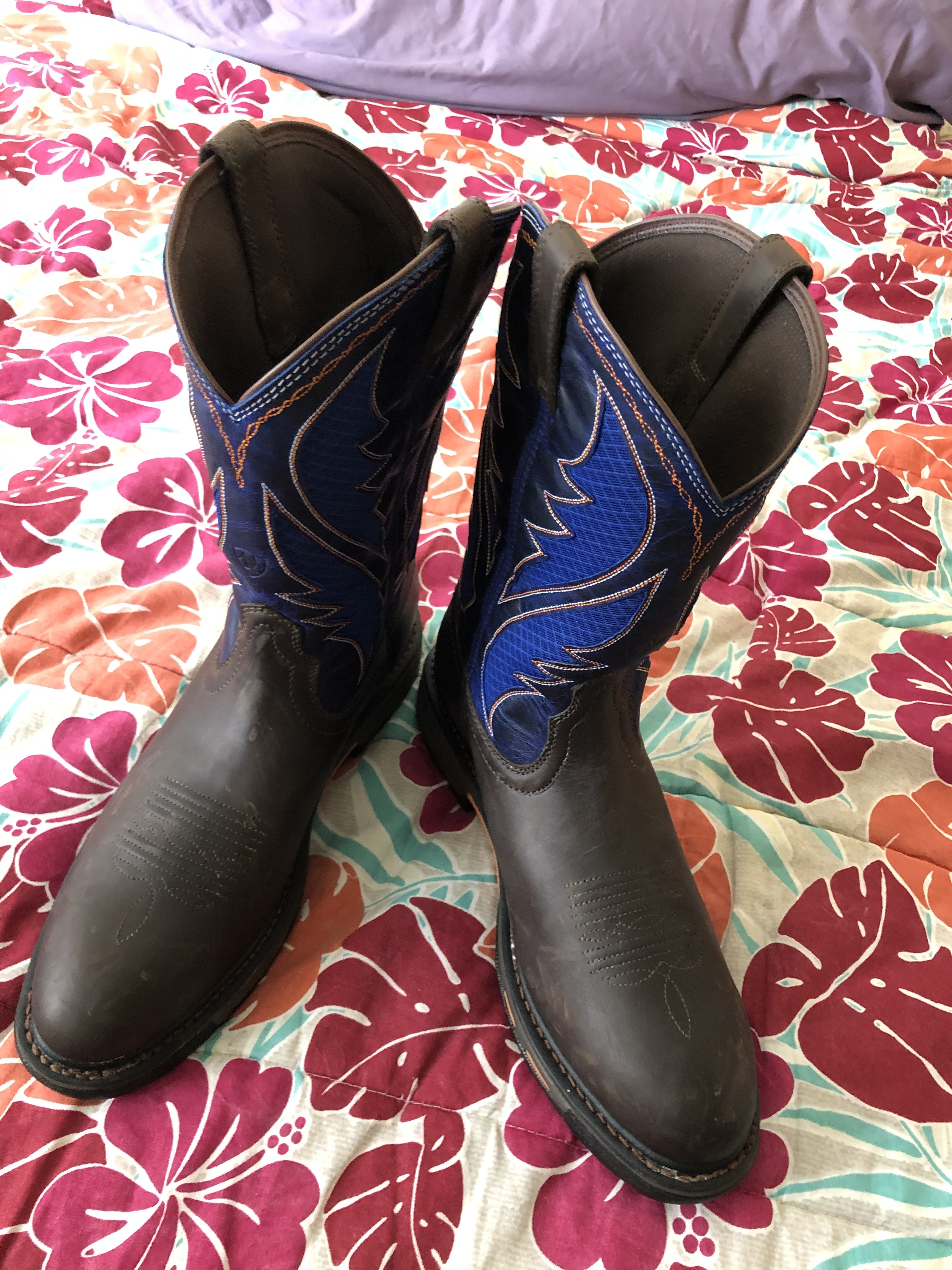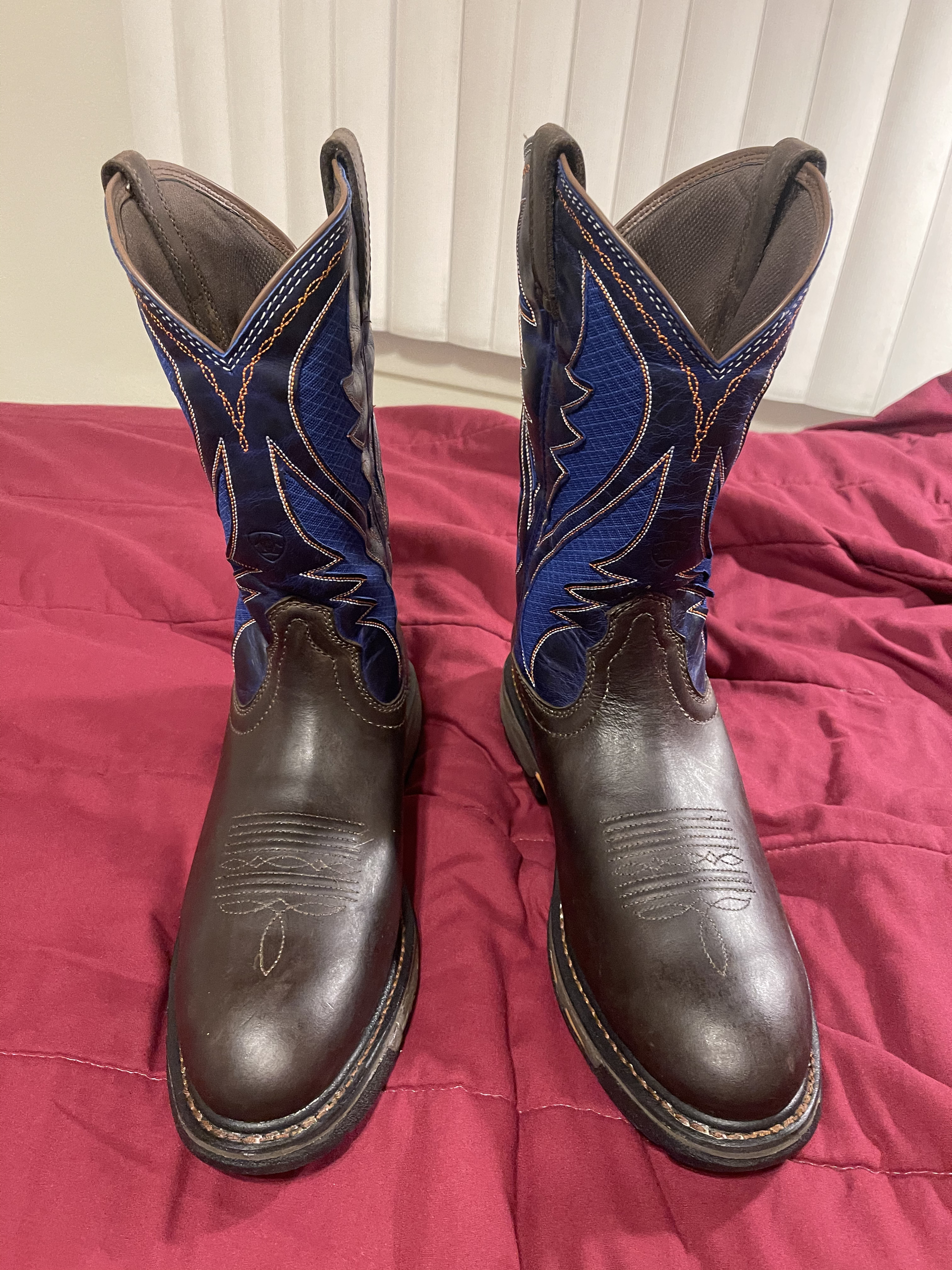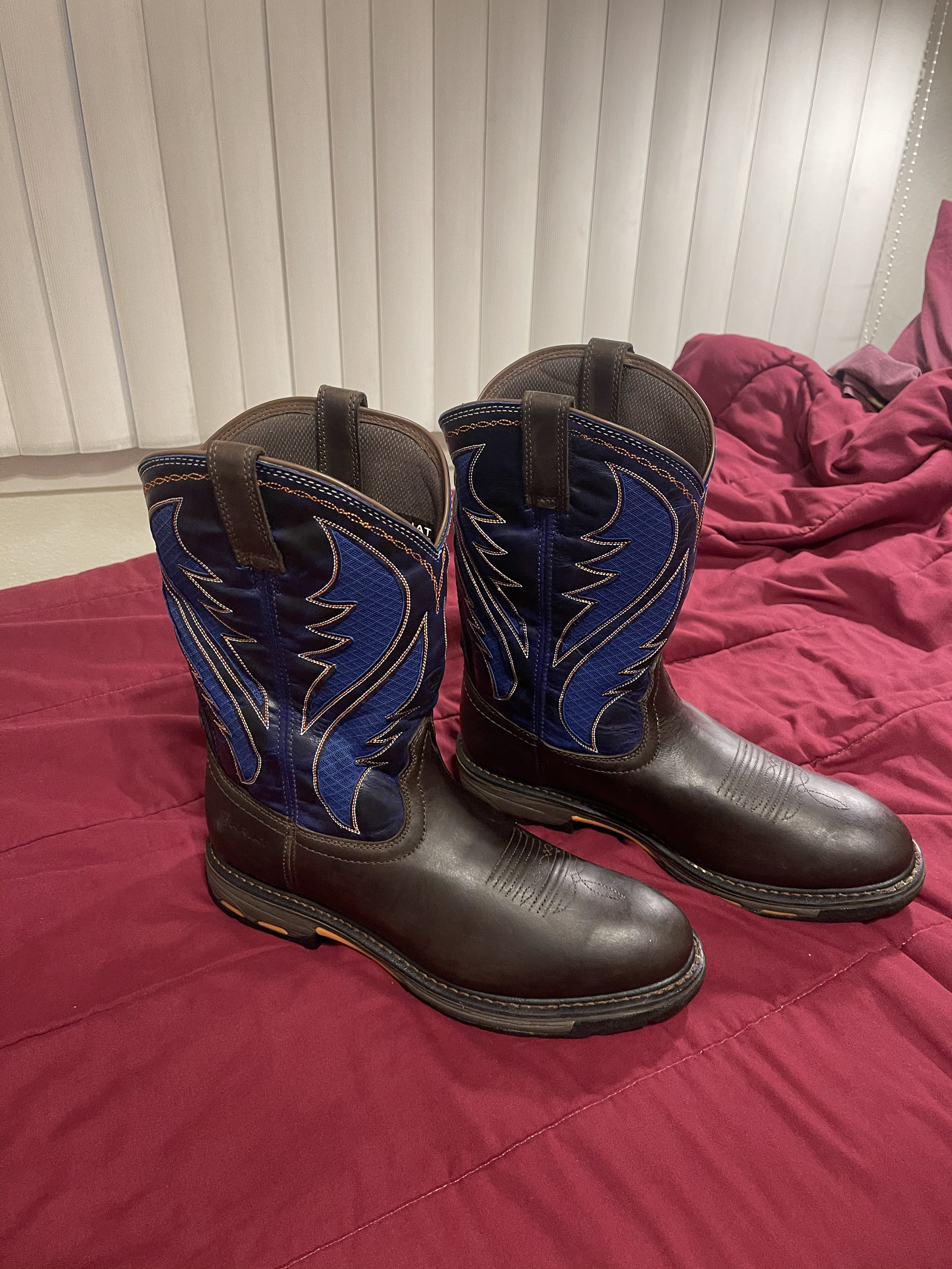 Ariat Workhog Ventek round toe work boots #100020090 for sale. Are brown and blue with a 12 inch shaft and a 15 inch circumference. Have 1.5 inch roper heel with a goodyear welt and mesh lining. Size 14D. Are in excellent shape, only been worn a few times. Original box available on request. $100 or best offer.