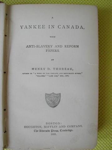 "A Yankee in Canada with Anti-Slavery and Reform Papers" by Henry D. Thoreau, published by The Riverside Press, Cambridge, 1881, loose signatures, loose binding stitching, wear to covers, pages bright and unmarked in this historical 129 year old book.