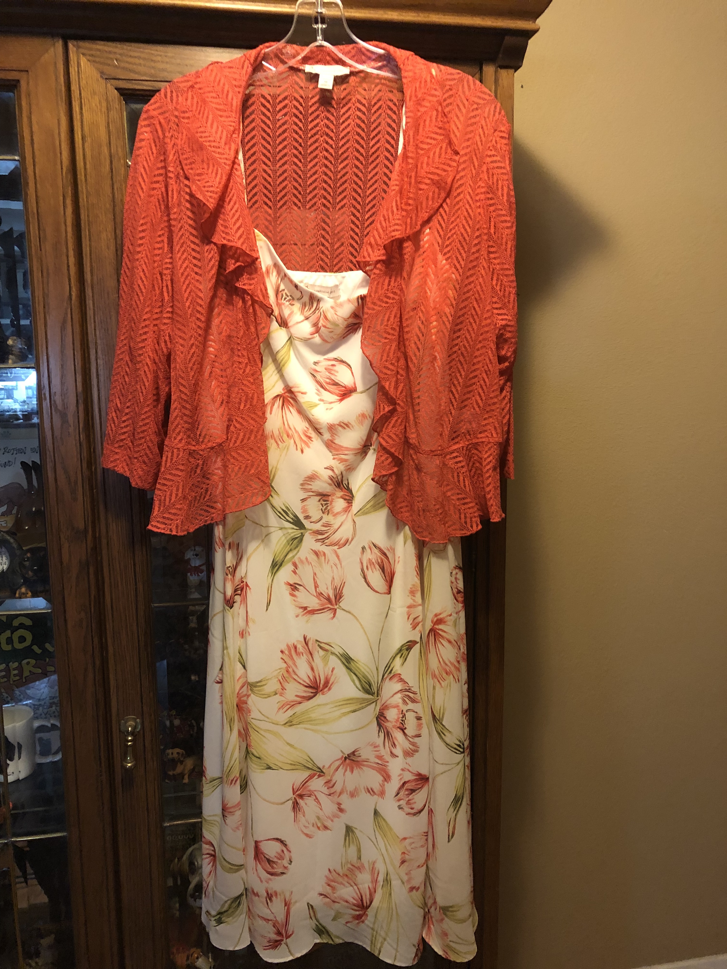 Light weight, 2 pc short dress, worn once. Beautiful pattern. Short and wispy, has liner and shell both made of polyester. Lacy cover made of Nylon. Size 18. Not good at matching colors, cover is a coral please see pics, show true color.