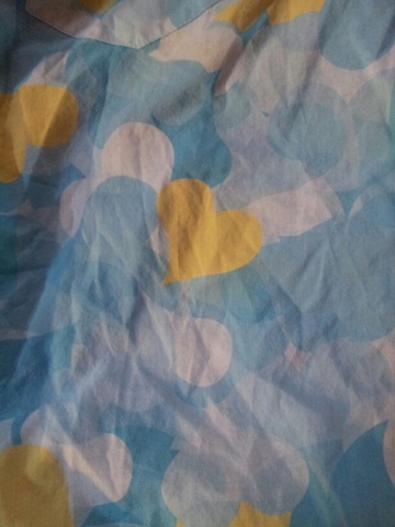 This night gown/dress is from India. It is a bright lovely blue and has purple flowers all over it. It's really fun! This can be used as a long night gown for a fun night or a casual night. It's really comfortable and loose. The material is a mix of cotton and other fabrics. It can be a little stiff, but with some washing it will become softer. It has a sweet rounded neckline and a little bow tie on the chest. The sleeves have purple dots. This items fits small - Large-medium