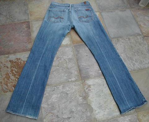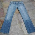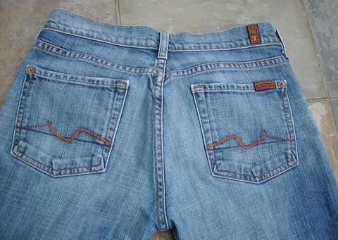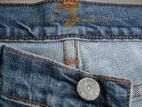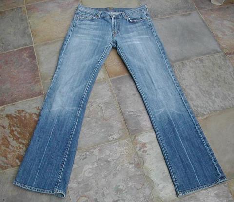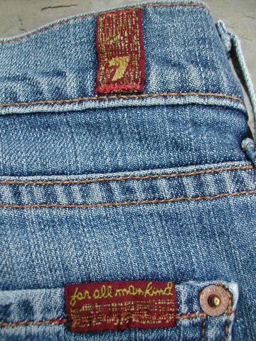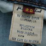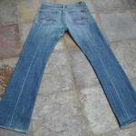 100% cotton bootcut, 5 pocket riveted, size 28, 33†inseam, 8.5†front rise, dark blue wash with gold thread detail, style 2-MOD-52, made in USA, only worn and washed once, no rips/stains/flaws