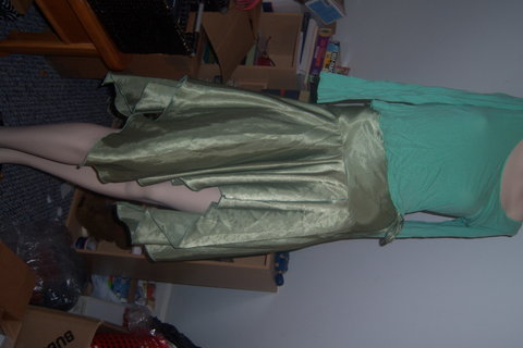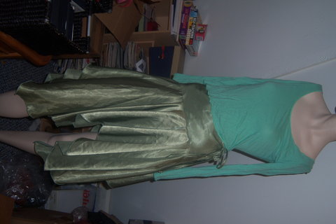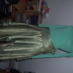 Here's a very unique skirt. Silky feel and silky fabric. Thick material. Falls on knee or above knee (depending on how tall you are). I only worn it a couple times, in great condition. Very flare and un-even bottom. Have straps that ties together on side to adjust the waist. (The waist can adjust smaller/bigger). This skirt will fit anyone who wears jeans size 4 and under. If you wear a size biger than 4, then it's too small for you.