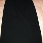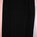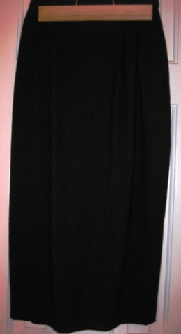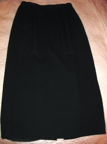 Talbots three-season black wool skirt. Fully-lined, inset zipper and elastic panels (short, ~2" panels in the waist band to ensure a flat, snug, tailored look- also to allow for that slice of chocolate cake you are eyeing...) </p> Two pleats on either side, this skirt is straight cut, but not a pencil. It's made to fasten around your waist, not below. The pleats allow you to sit comfortably, And a mid-center vent allows for you to really walk, and not totter. I'm 5'2" (with super long legs for my height), and it strikes me a few inches (2 or 3?) below my knees.</p> This is for work wear or for church- your all-purpose, well-made black wool skirt. Not so much an evening wear piece, and it probably wouldn't look right at school, either. But hard to beat for a wardrobe staple.</p> Just drycleaned.