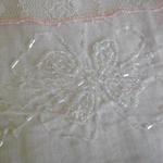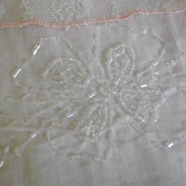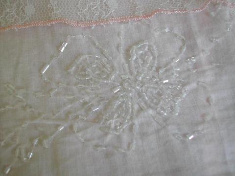 Sheer white lace netting with sequins and a pink cotton bead embroidered lining, zipper in back