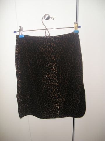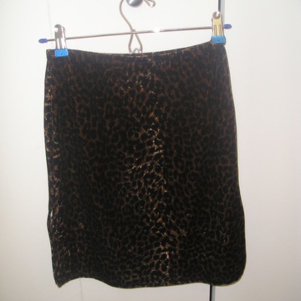 Cute leopard print mini skirt. A little on the dark color side. Stretch fabric. Looks cute w/ boots.