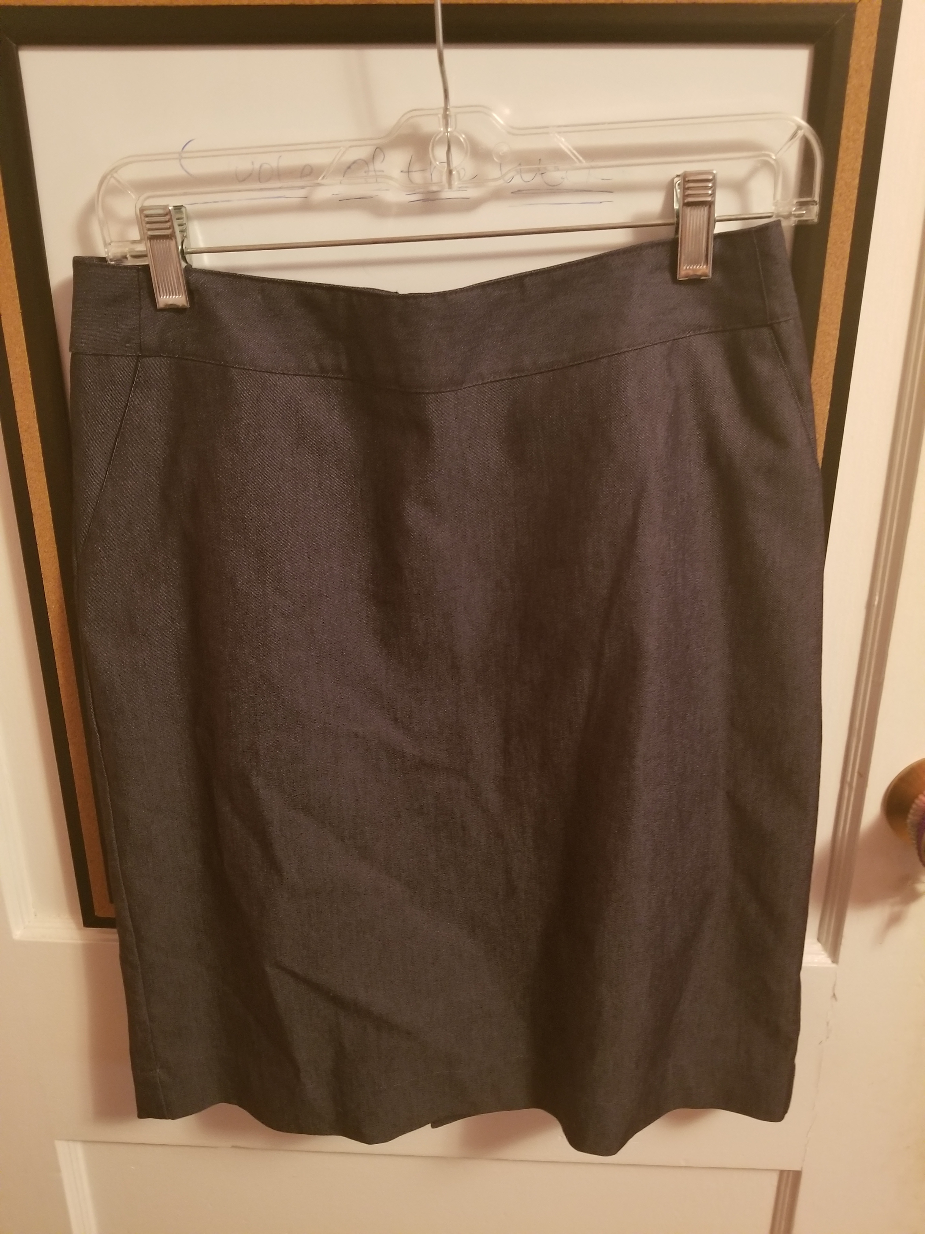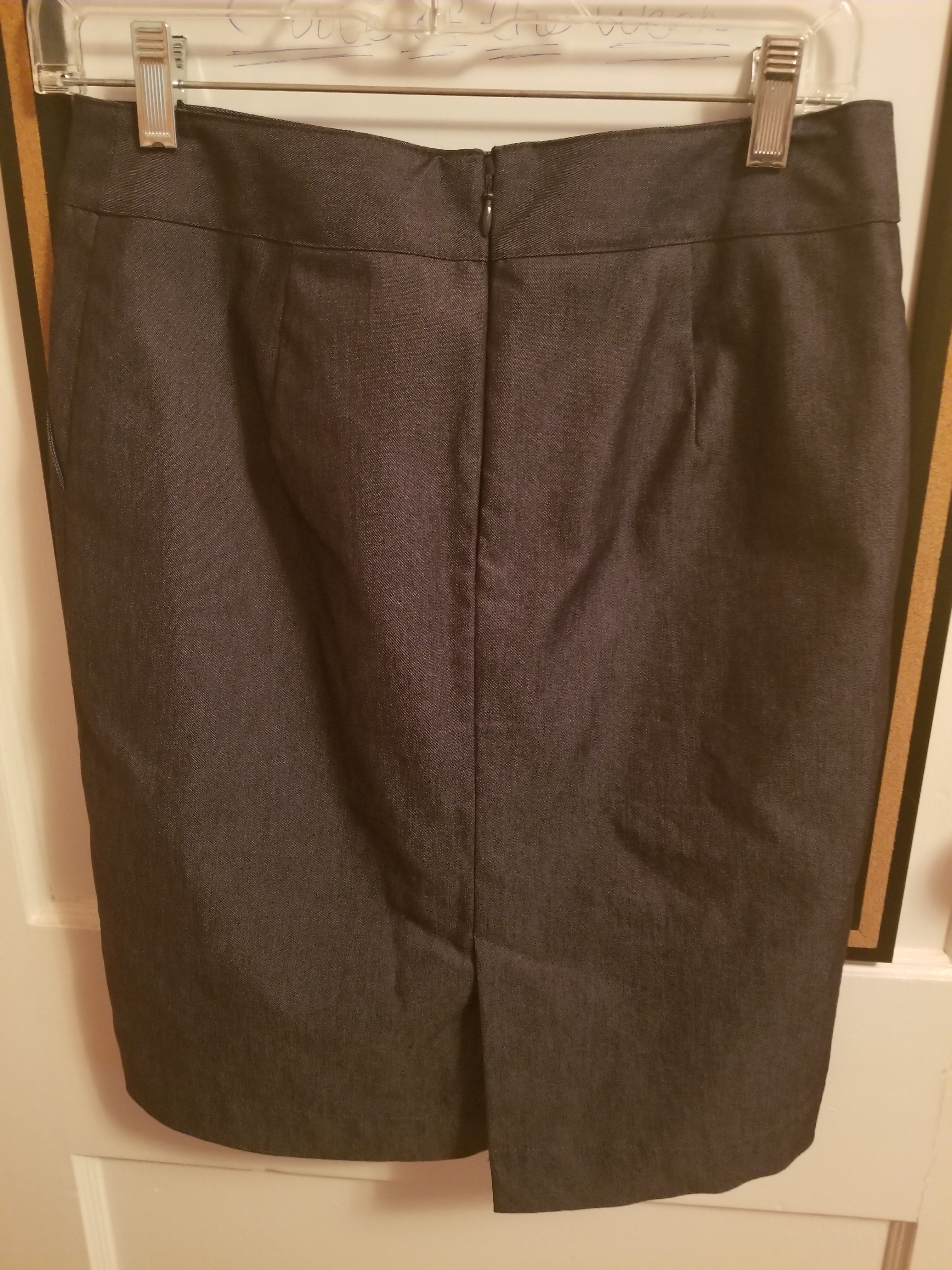 This skirt is a Merona brand pencil skirt. Size 2. Skirt has pockets and is a dark blue, almost denim color. Skirt is professional and would be suitable for business attire.