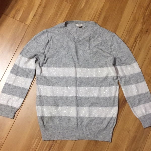 This is a grey sweater from Banana Republic. Tight fitting, especially around the arms, but has a nice look!