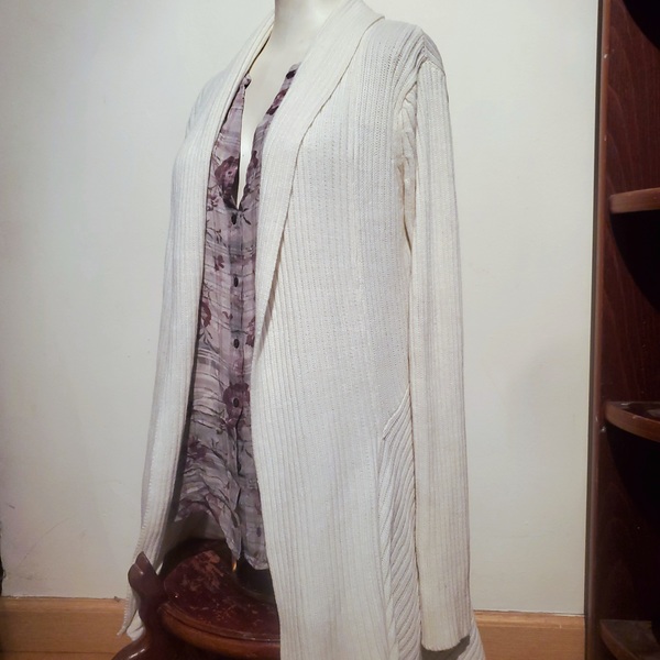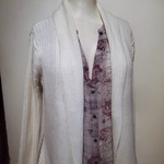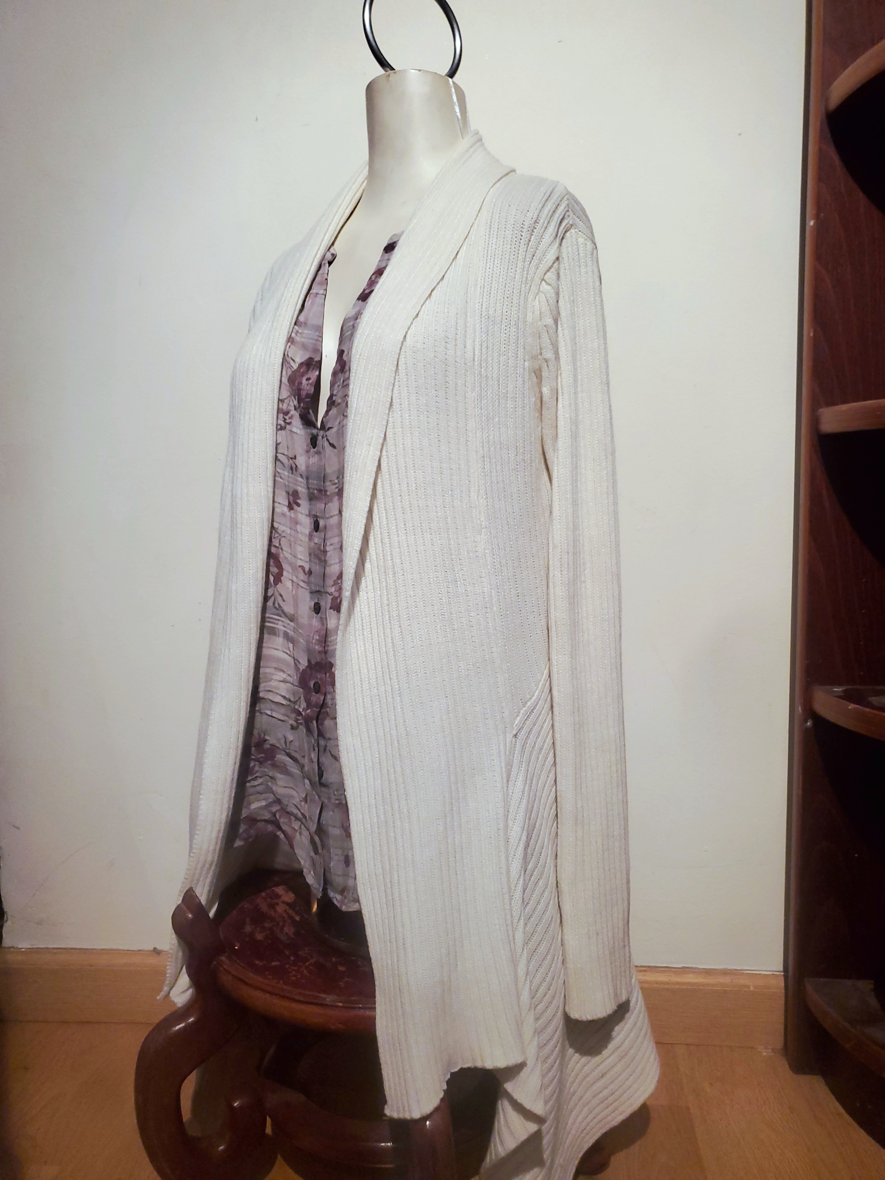 White 100% cotton Chaps cardigan. Cowl neckline, 2 pockets, 5 large white buttons.