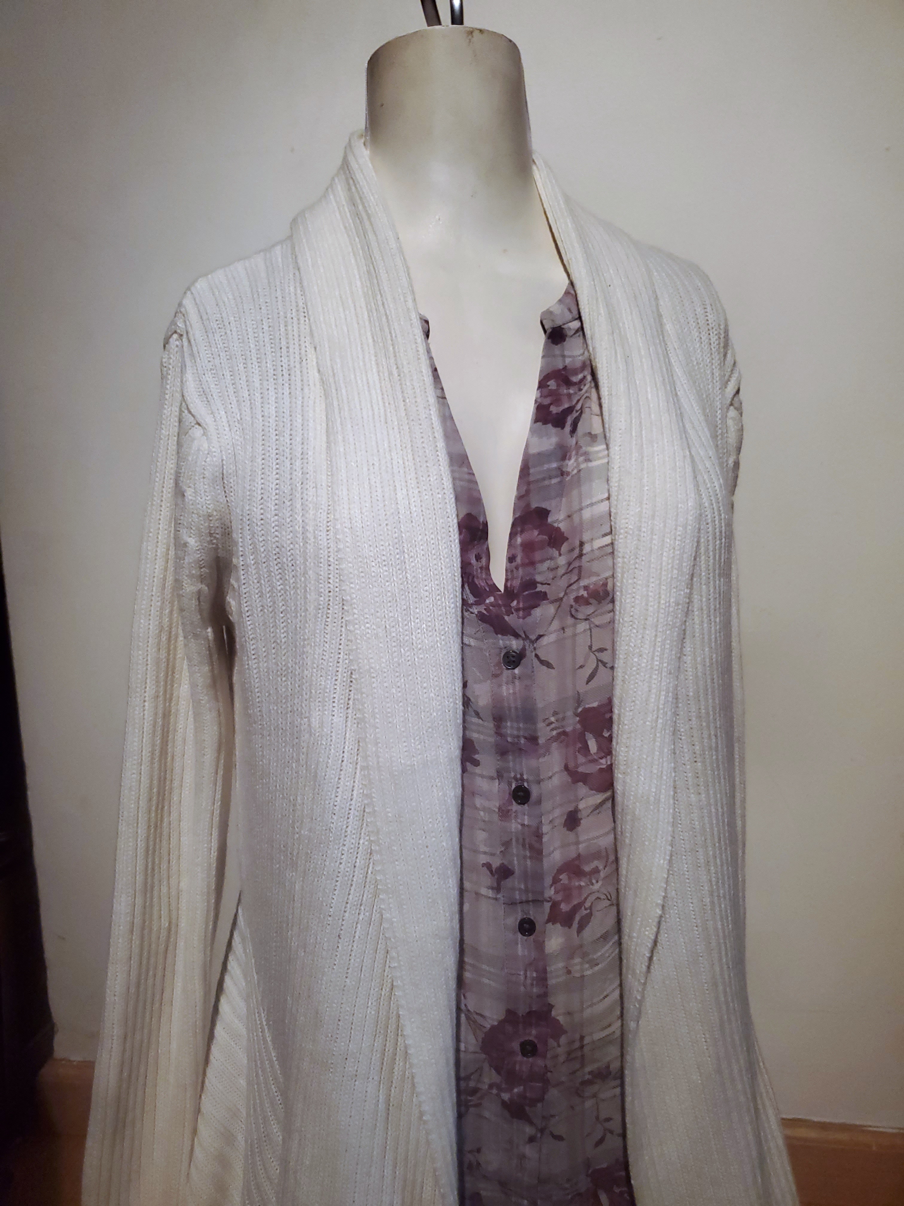 Very cute lightweight sweater that looks great alone or under a cardigan. A collared shirt underneath would make it ideal for being dressed up or down. Also could be worn as a pajama top.