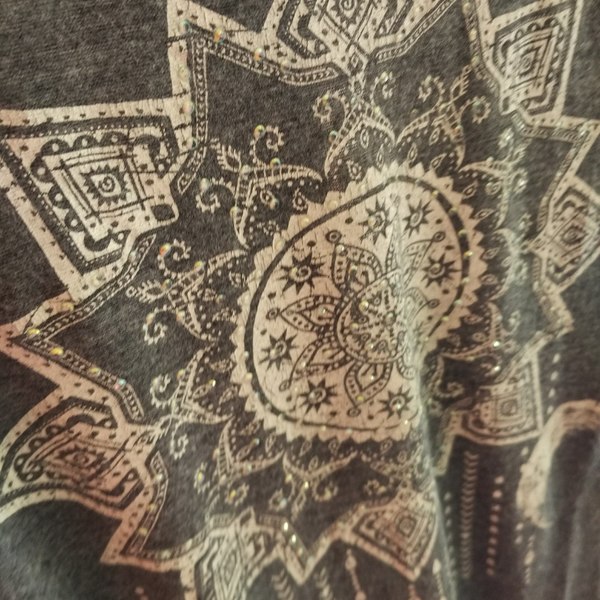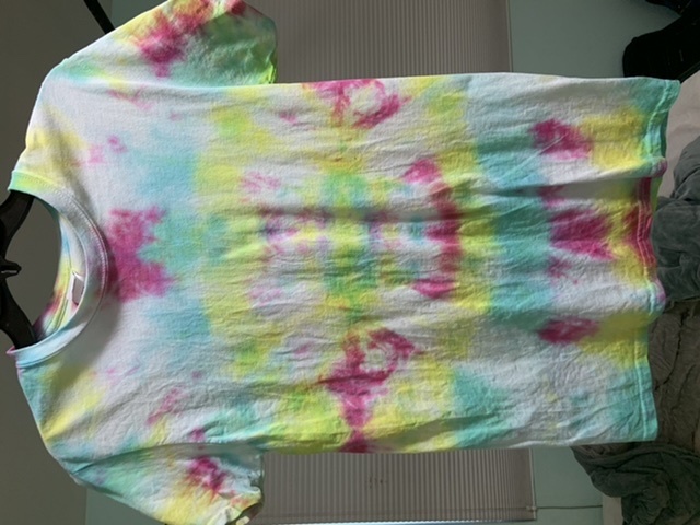 Tie dye t-shit. White, mint, yellow and magenta. Would be great to crop, up cycle or as is. Slightly wrinkled but easy to iron or steam out. The color distribution is pretty equal so no one prominent color.