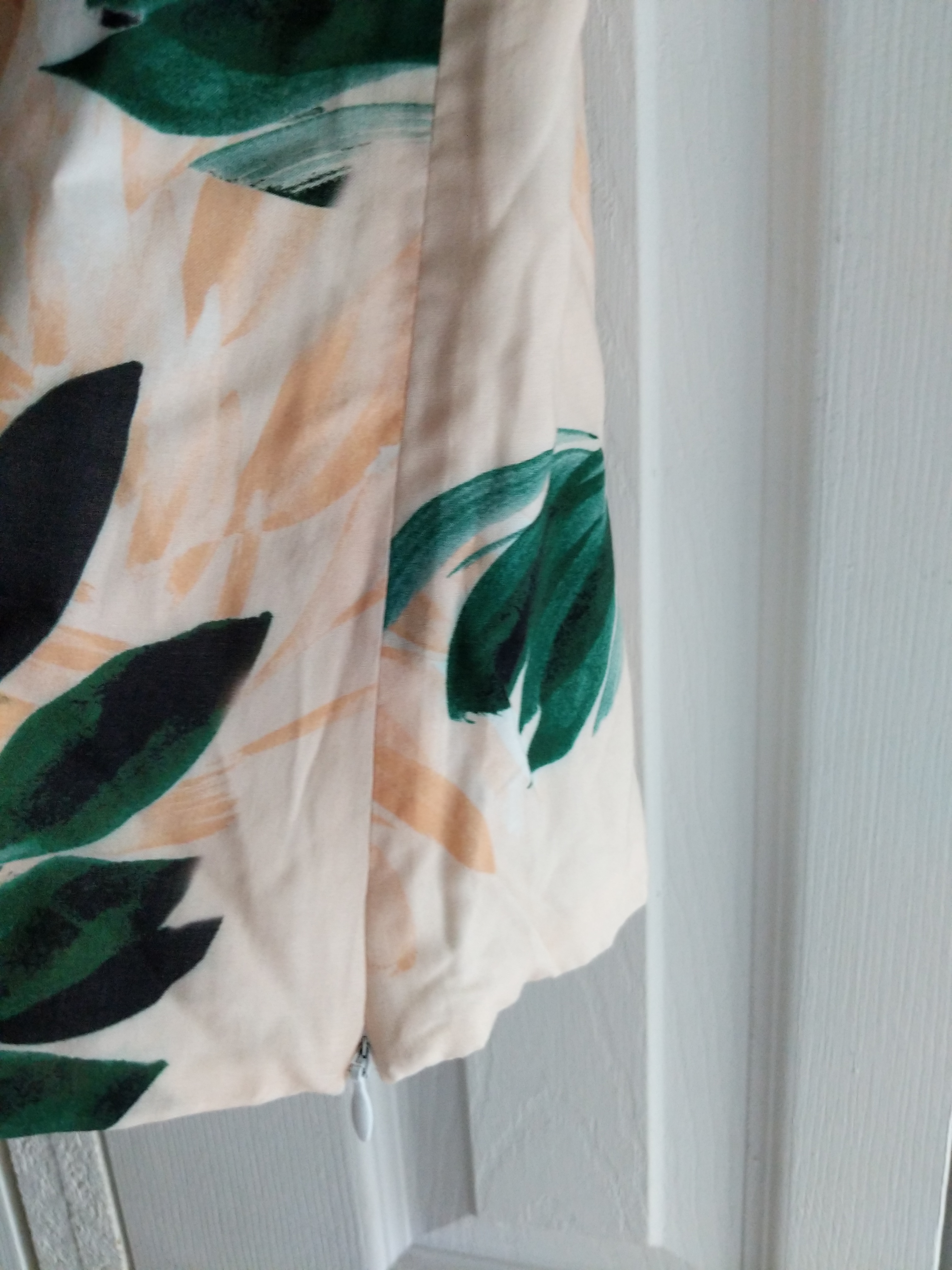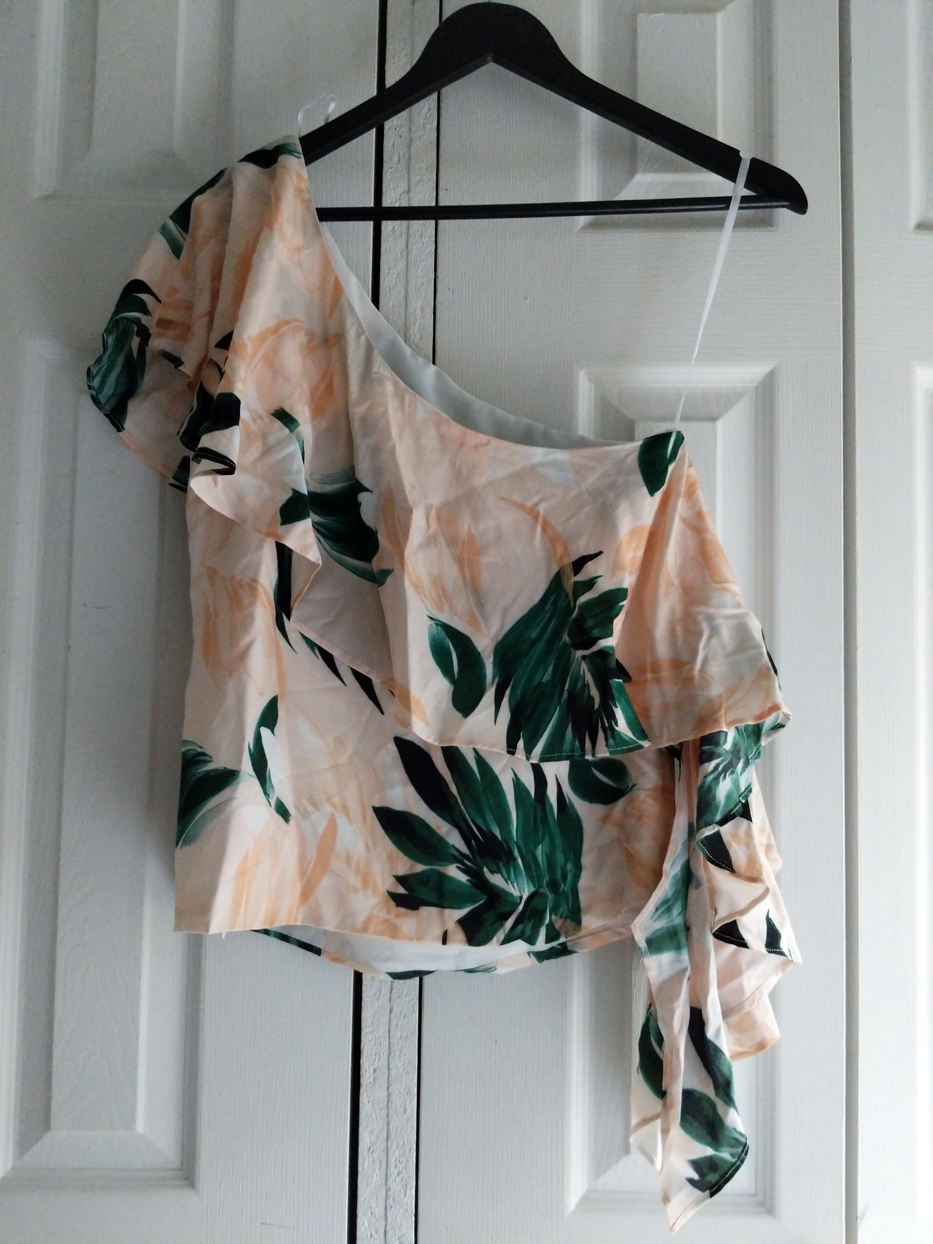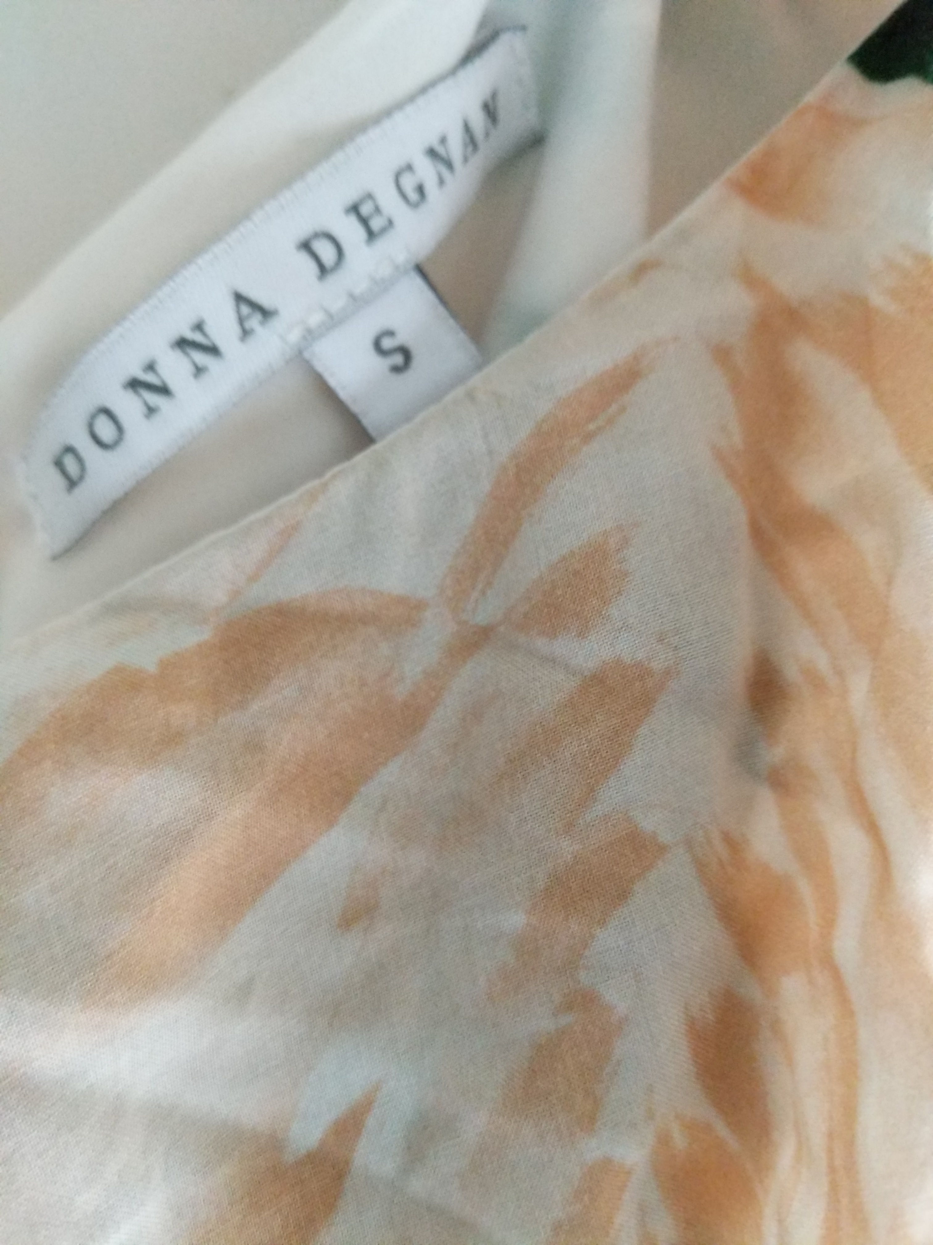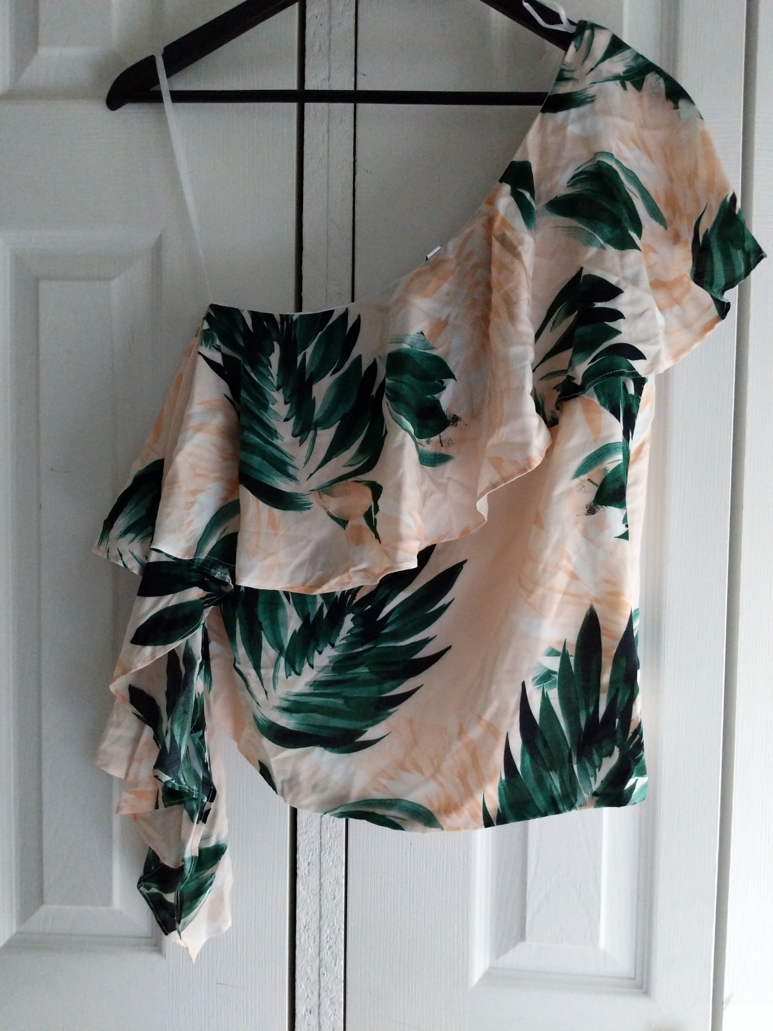 Donna Degnan Leaf Print One Shoulder Nwot Sz S pink green and white. There is a side zipper. Color isn't for me.