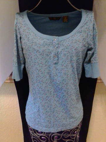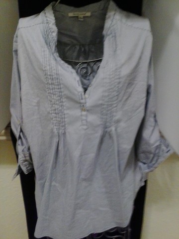 Nice shirt, has been worn but is still awesome :) Front has front pleats (see photo) around the button placket, and on the mandarin collar. The fabric is a light denim colored champray. Cotton. Made by SA Banks, size 10.