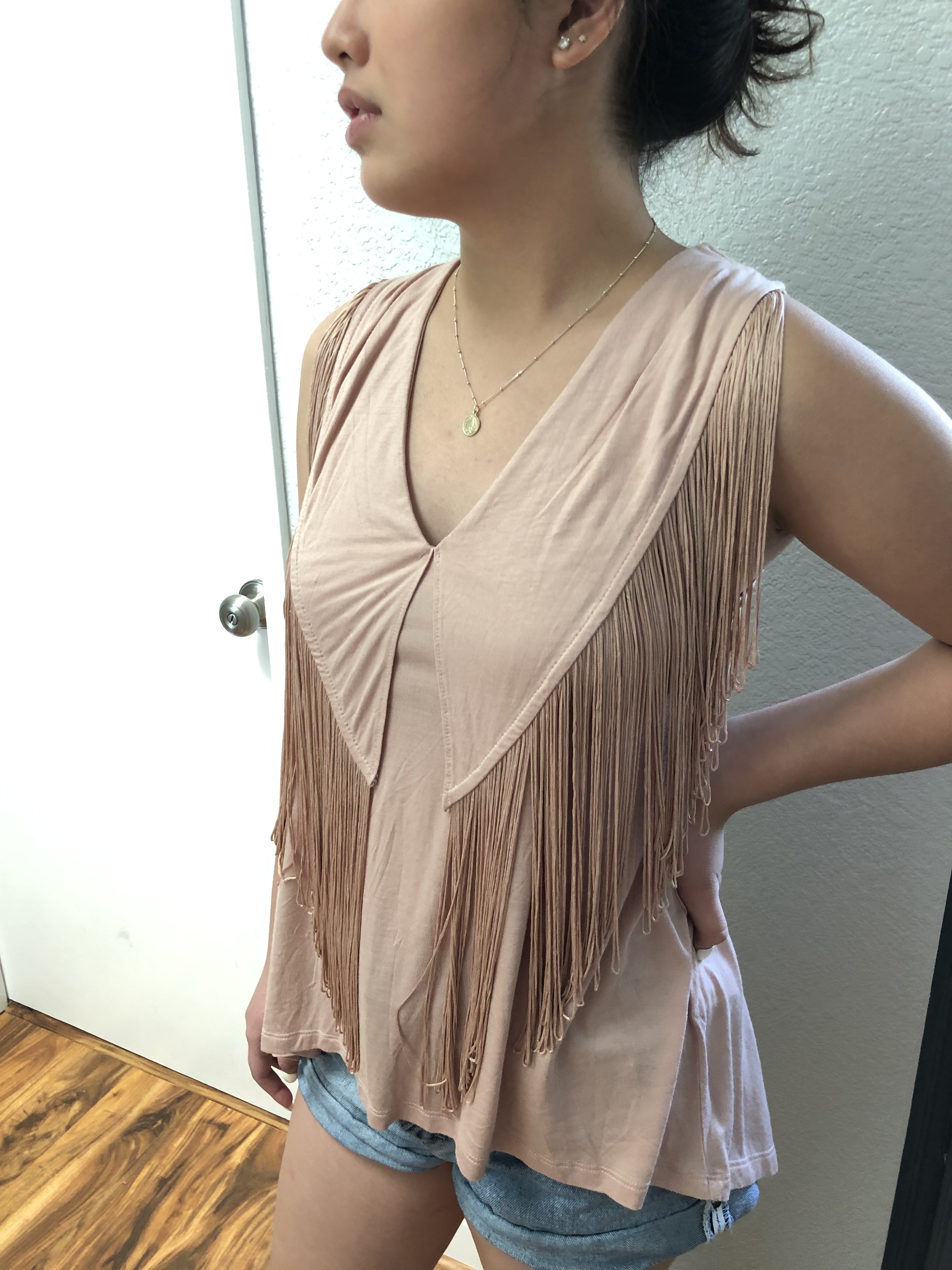 Pastel pink sleeveless top for the summer with breathable soft cotton. Cute fringes accentuate the top that flows and moves as you do. Perfect for a brunch or day out with the girls or any occasion at all. All items open for swap