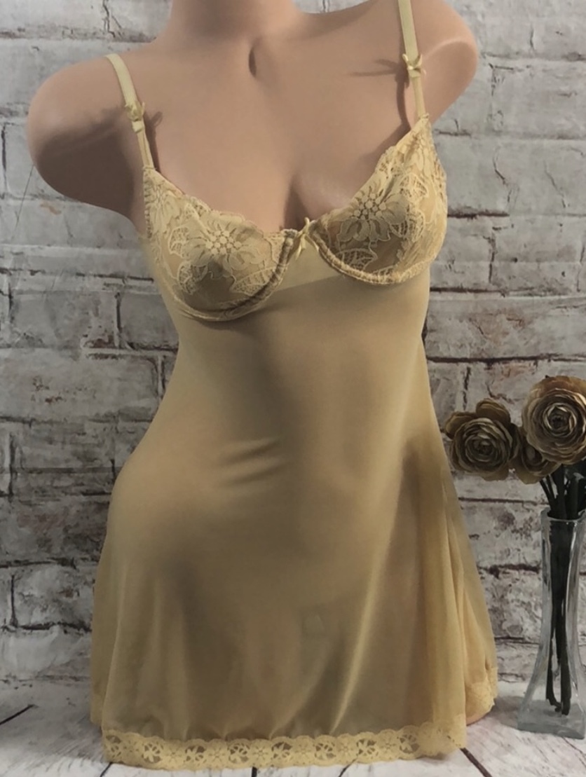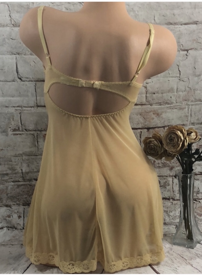Victoria’s Secret Intimates Chemise Slip Babydoll Gold Body: 100% Polyester Mesh Exclusive Of Trims Cups: 86% Nylon 14% Spandex Floral Lace Trim Size 34B Excellent Preowned Condition