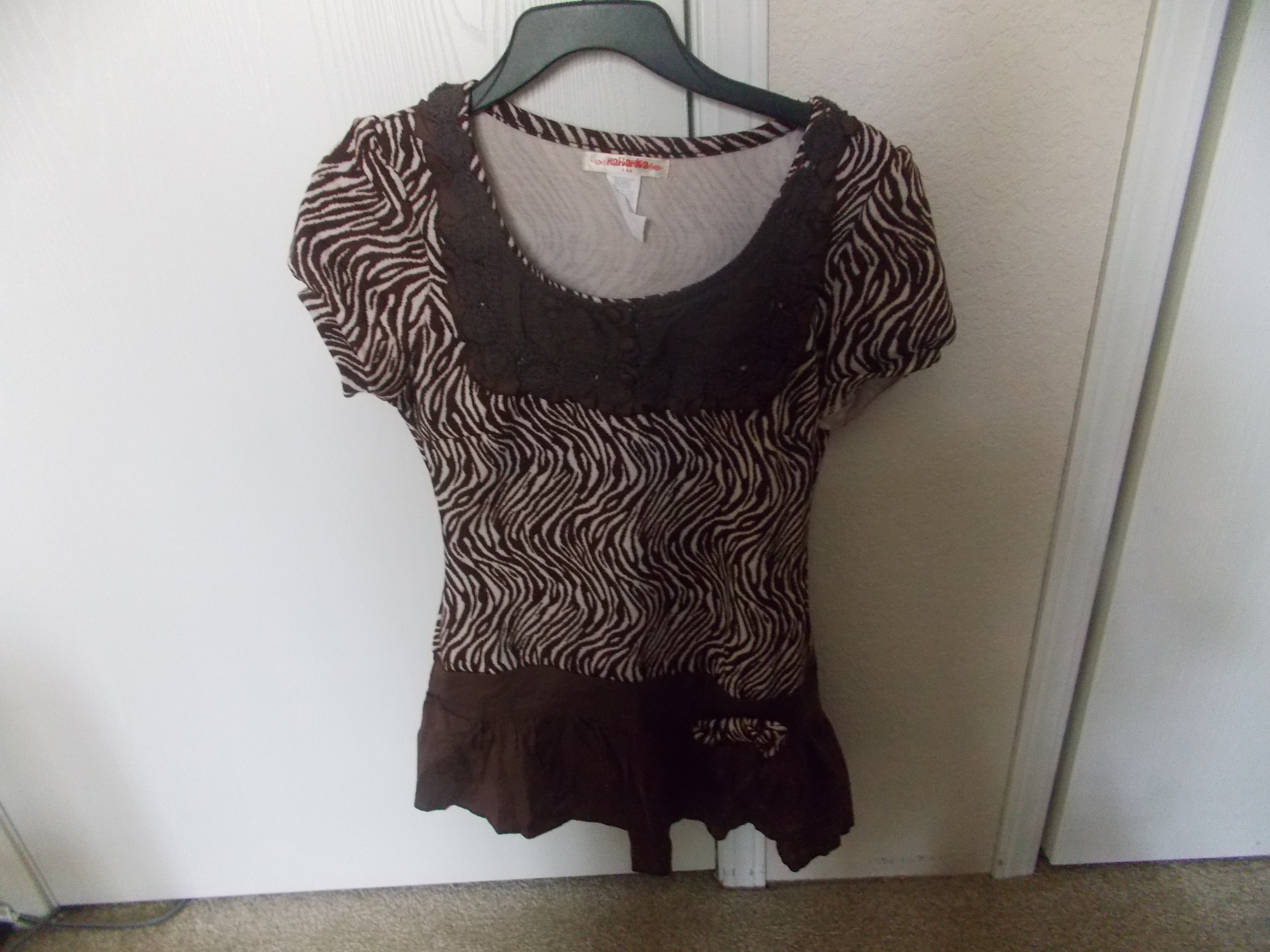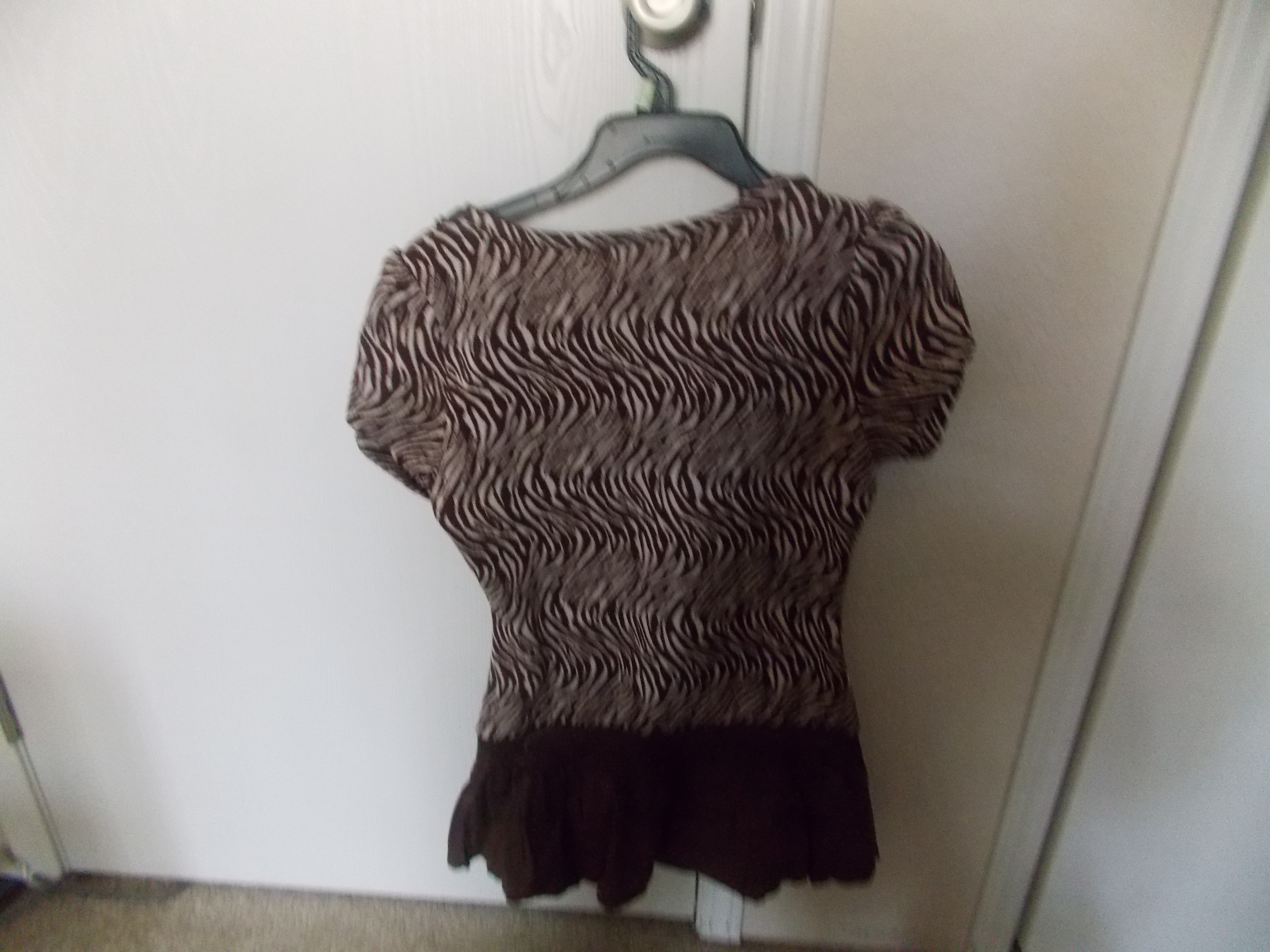 naranka 95% polyester 5% spandex 95% cotton 5 % spandex new without tags never wore says its a large but I would say a small large or a medium. brown and white with crochet in front 3 buttons.flares at the bottom brown with a bow on side.