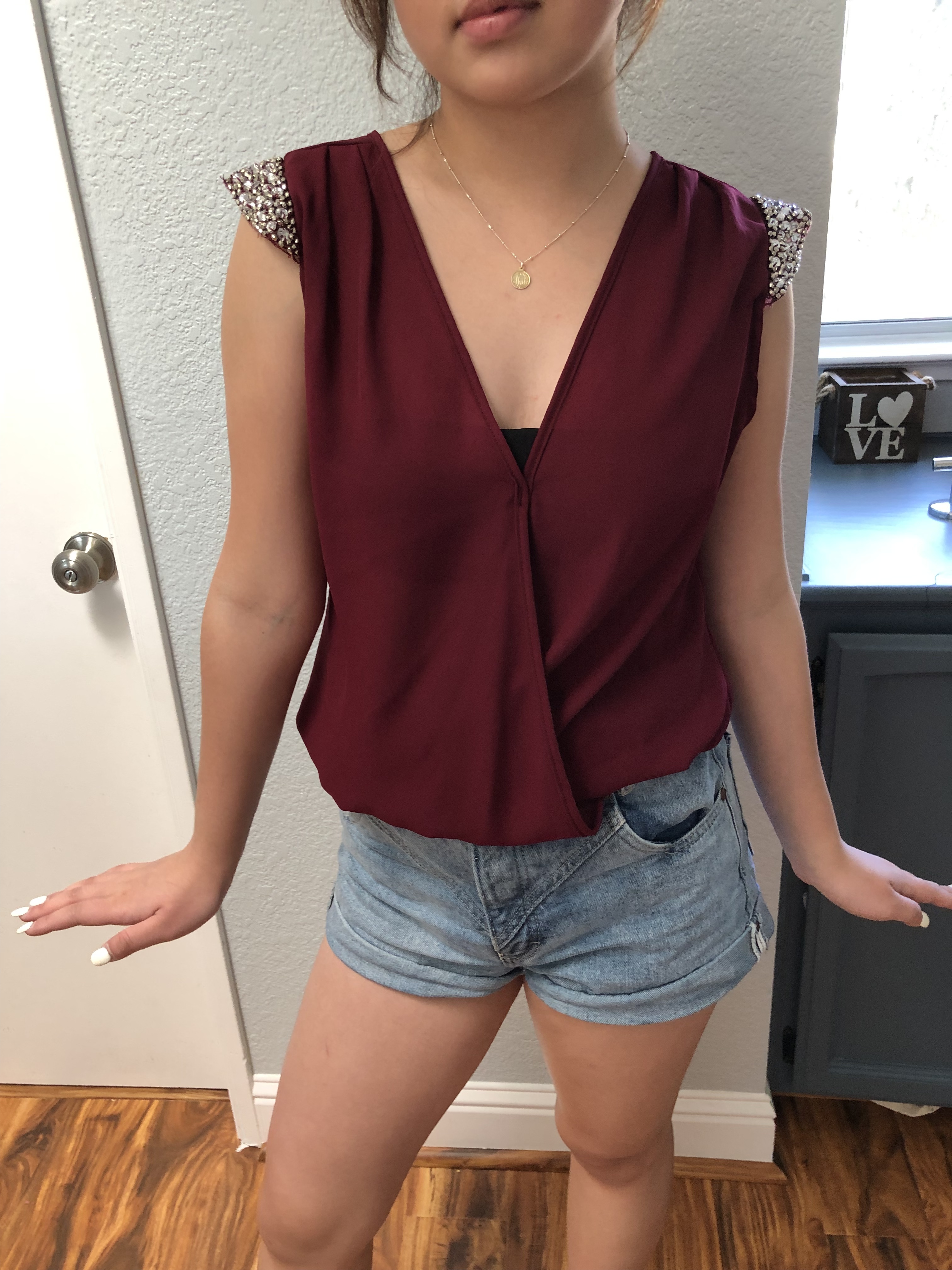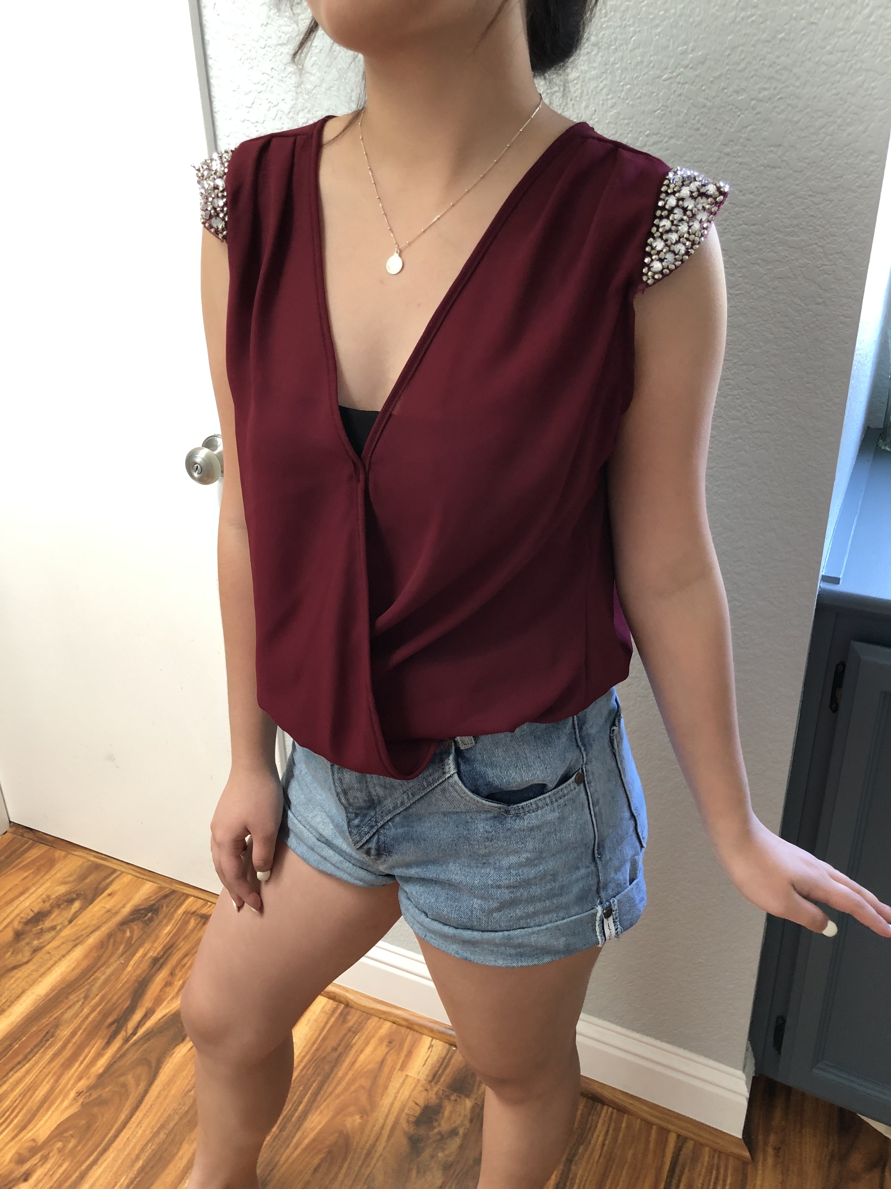Elegantly designed, this Maroon top is delicately studded with beads and stones on both couples sleeves. Chiffon material makes it easy to wear without being tight fitting. Sexy back which ties at the back. Item open to swap.