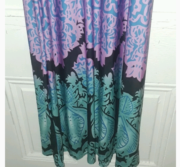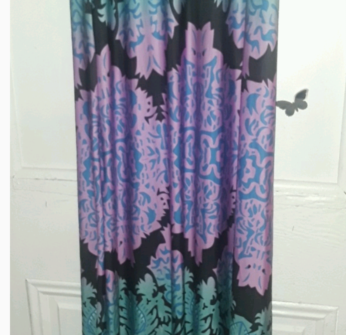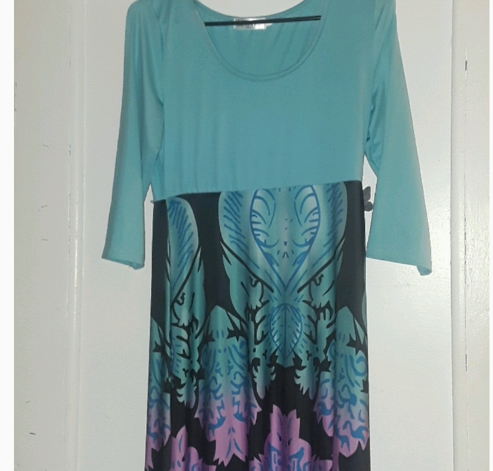 3/4 sleeve stretchy maxi dress. Length is to the floor. Bust is a solid blue color which then fades in an ombre like style to purple, pink and back to blue again throughout the length of the dress. Size large by L Show Brand. In excellent condition, worn once or twice