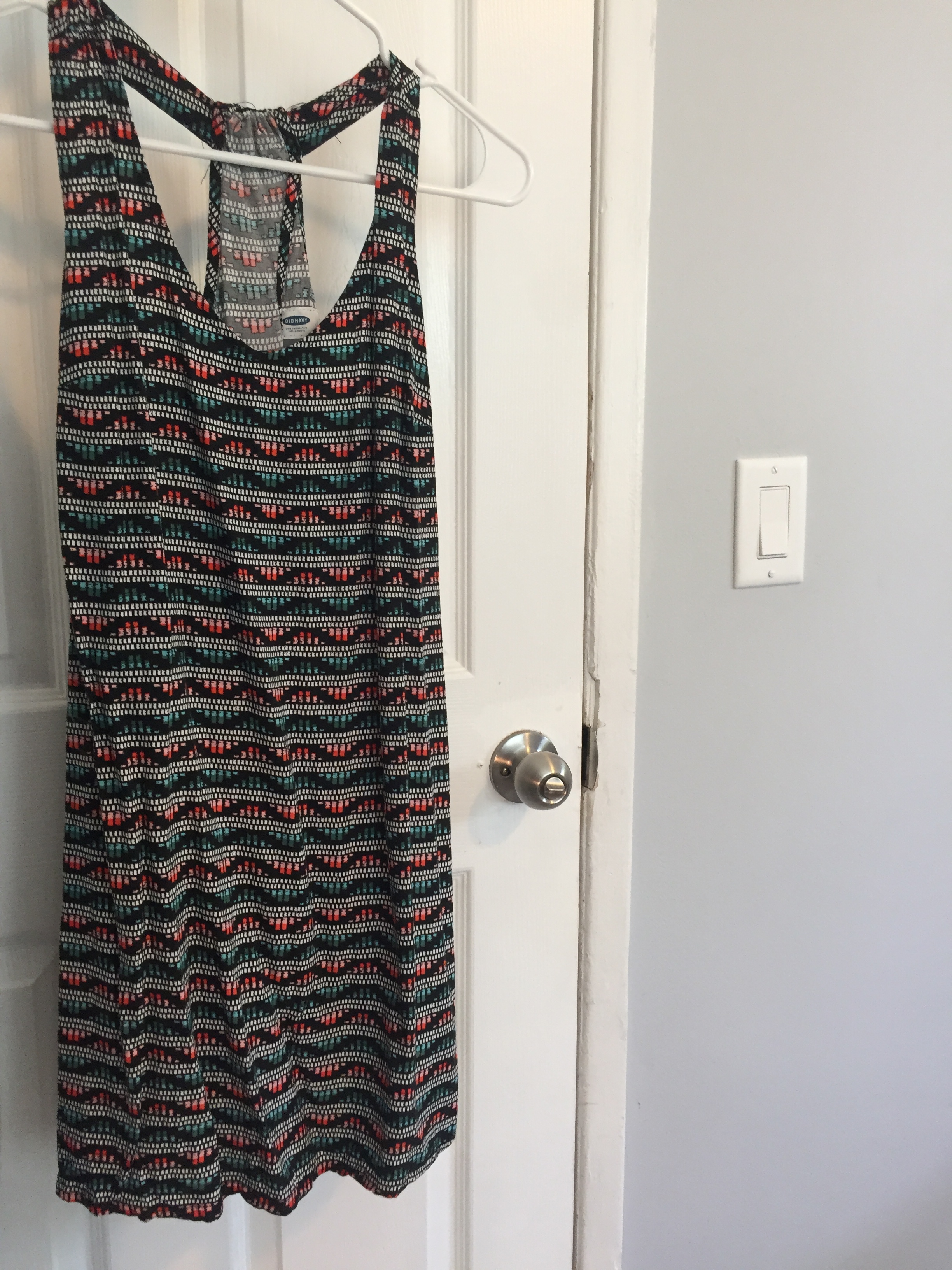 This is an Old Navy dress that is in very good condition. It is black with blue, white, and red/orange designs. It has a halter scoop neckline. Very cute and comfortable.