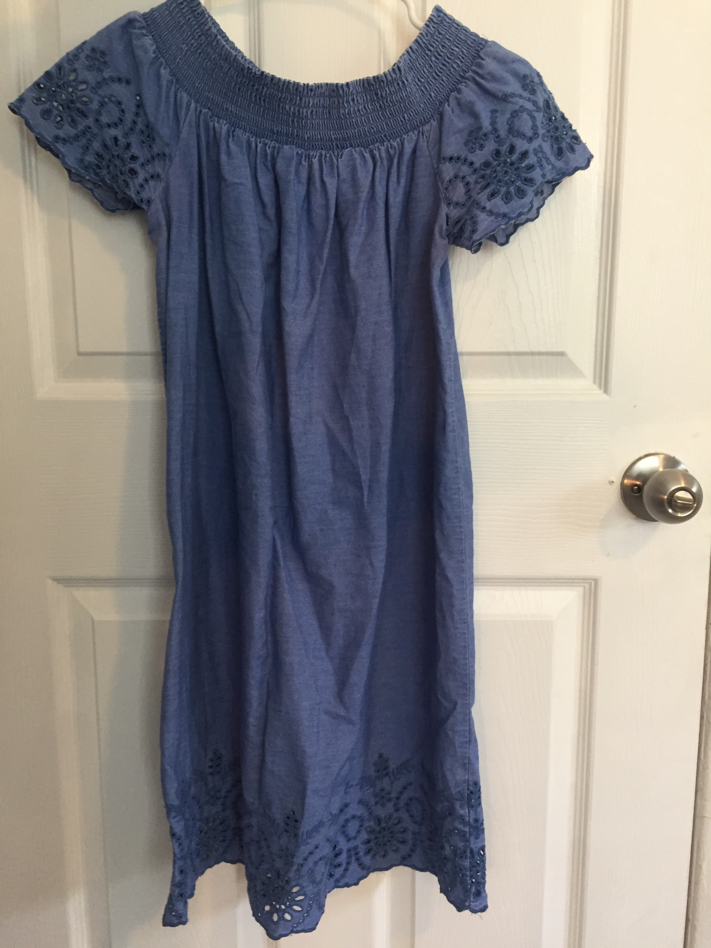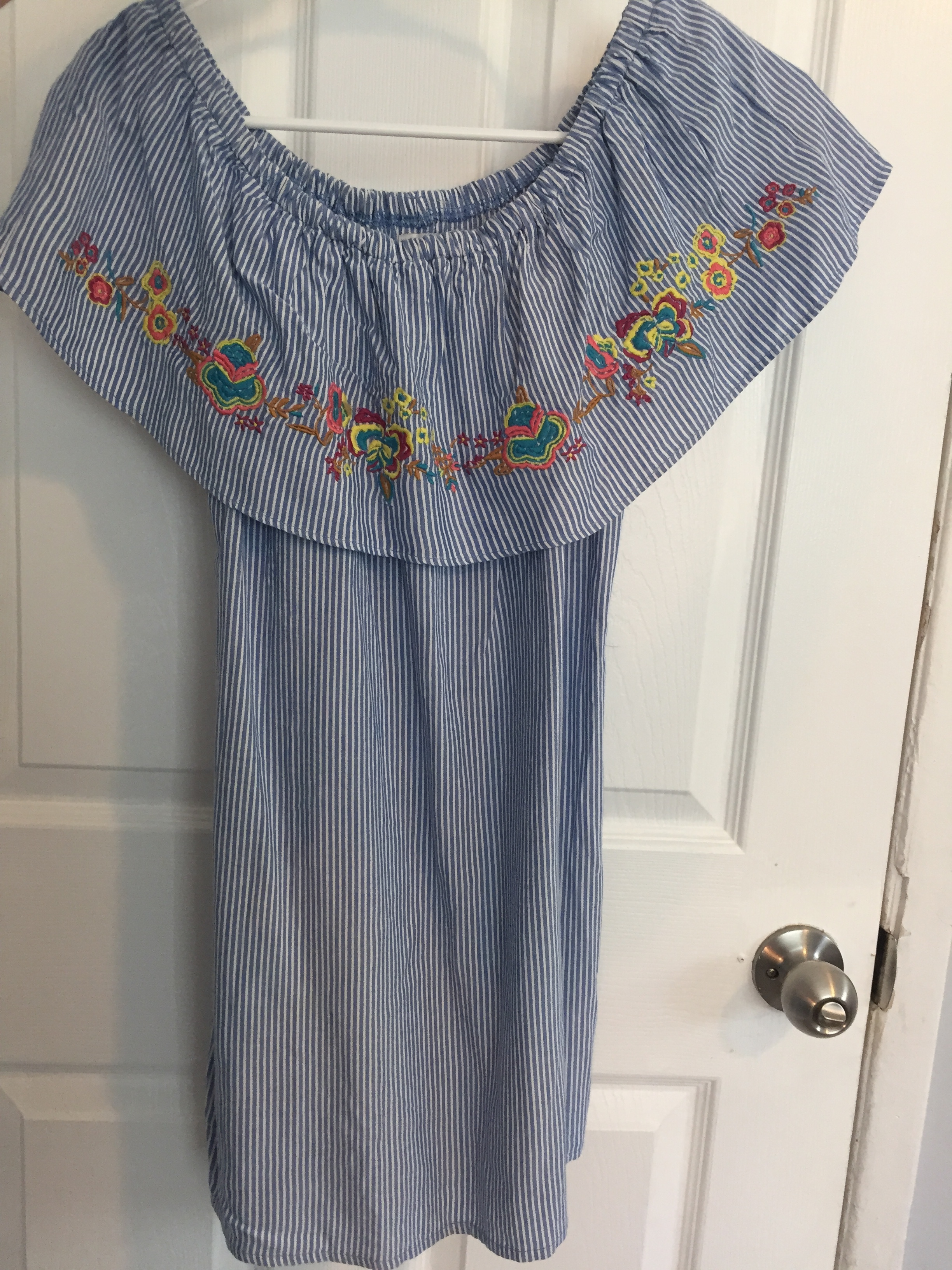 Light blue off the shoulder dress with floral embroidery on the sleeves. New and never worn. Just needs to be ironed or steamed.